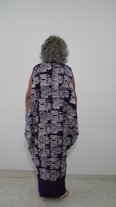 Des touches de pagne baoulé viennent ponctuer la silhouette, apportant profondeur, contraste et un lien direct avec l’héritage ivoirien. Ample et fluide, elle se déploie autour du corps avec légèreté et majesté.