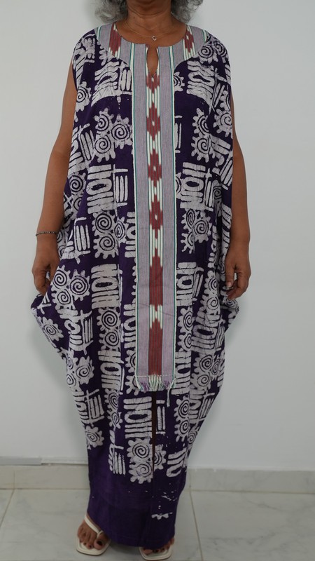 Confectionnée dans un batik traditionnel teint à la main, aux subtiles nuances d'indigo et de blanc, cette robe longue porte en elle toute la richesse du savoir-faire africain. Des touches de pagne baoulé viennent ponctuer la silhouette, apportant profondeur, contraste et un lien direct avec l'héritage ivoirien. Ample et fluide, elle se déploie autour du corps avec légèreté et majesté. 🌿 Pourquoi vous allez l'adorer : ✔️ Tissu batik unique, chaque robe est une pièce singulière. ✔️ Coupe fluide et confortable, parfaite pour sublimer vos mouvements. ✔️ Détails en pagne baoulé, pour une touche artisanale authentique. ✔️ Entièrement cousue main dans notre atelier en Côte d'Ivoire. 📍 Taille unique (S à XXL) – Pensée pour toutes celles qui veulent porter une histoire sur leur peau.