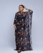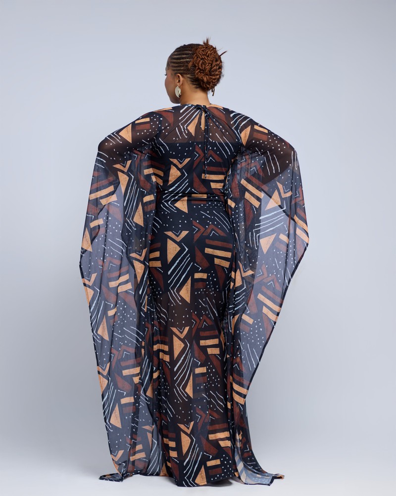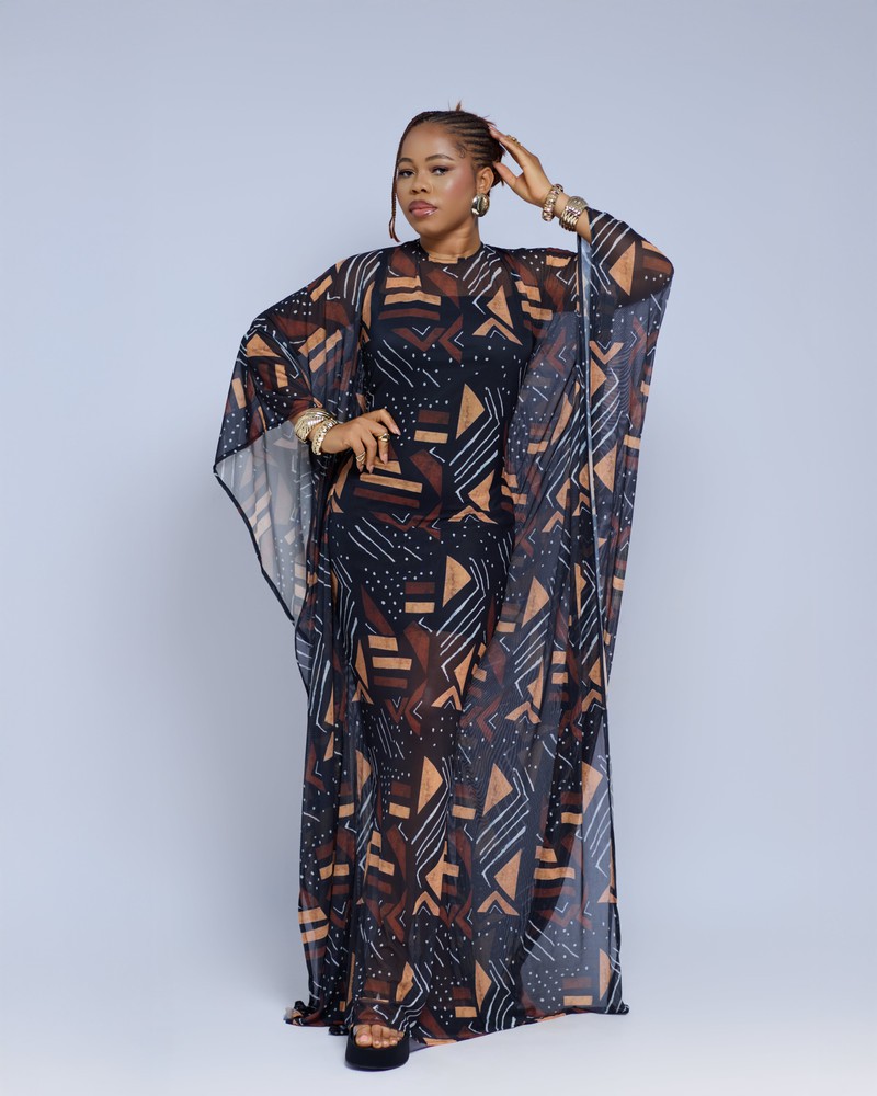Robe longue en tulle (Mesh) + Robe noire moulante en dessous Motif : Bogolan Taille mannequin : M (38)