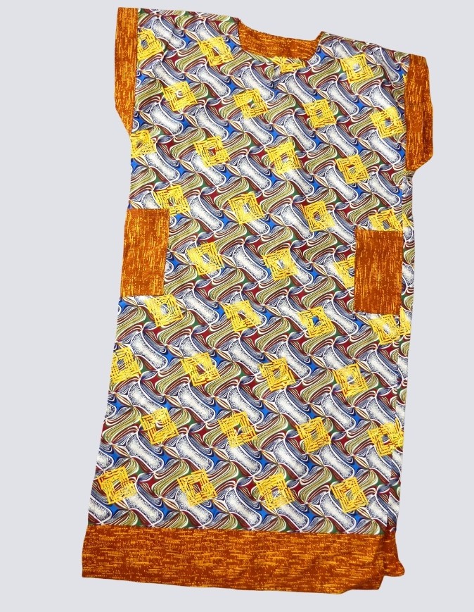 Robe boubou caftan imprimée en coton mi-longue. Manches courtes, évasée, ce qui permet une meilleure aisance et la possibilité d’enfiler la robe quelque soit la taille. Le tissu est épais, 2 grandes poches sur les cotés, boubou mixte homme et femme col tunisien.