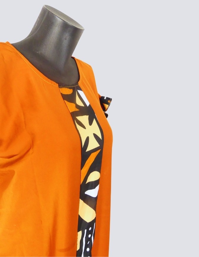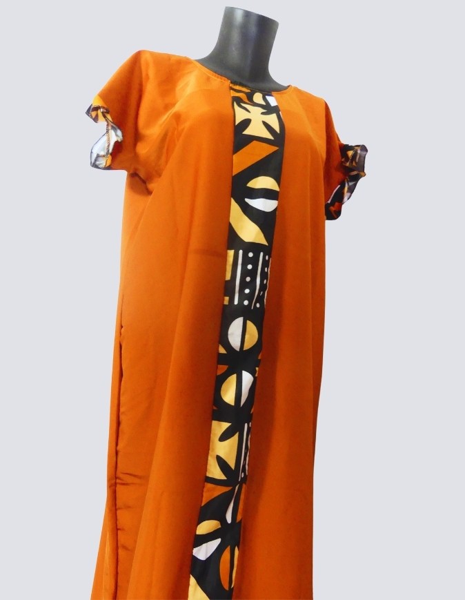 robe longue boubou robe tunique bogolan orange caftan africain en wax S/M/L/XL tissu satin de soie motifs bogolan et polycoton uni grande bande bogolan en satin de soie à l’avant et l’arrière de la robe