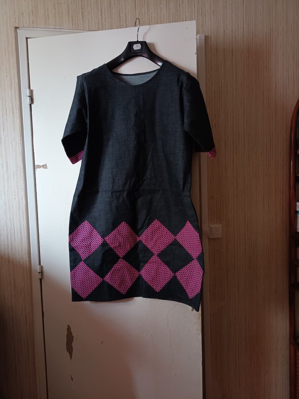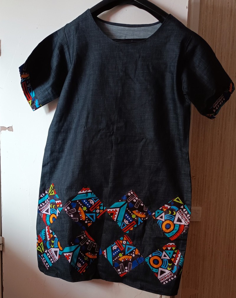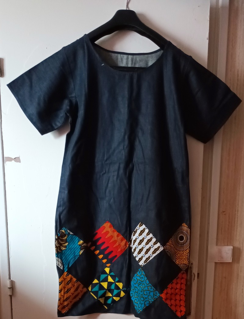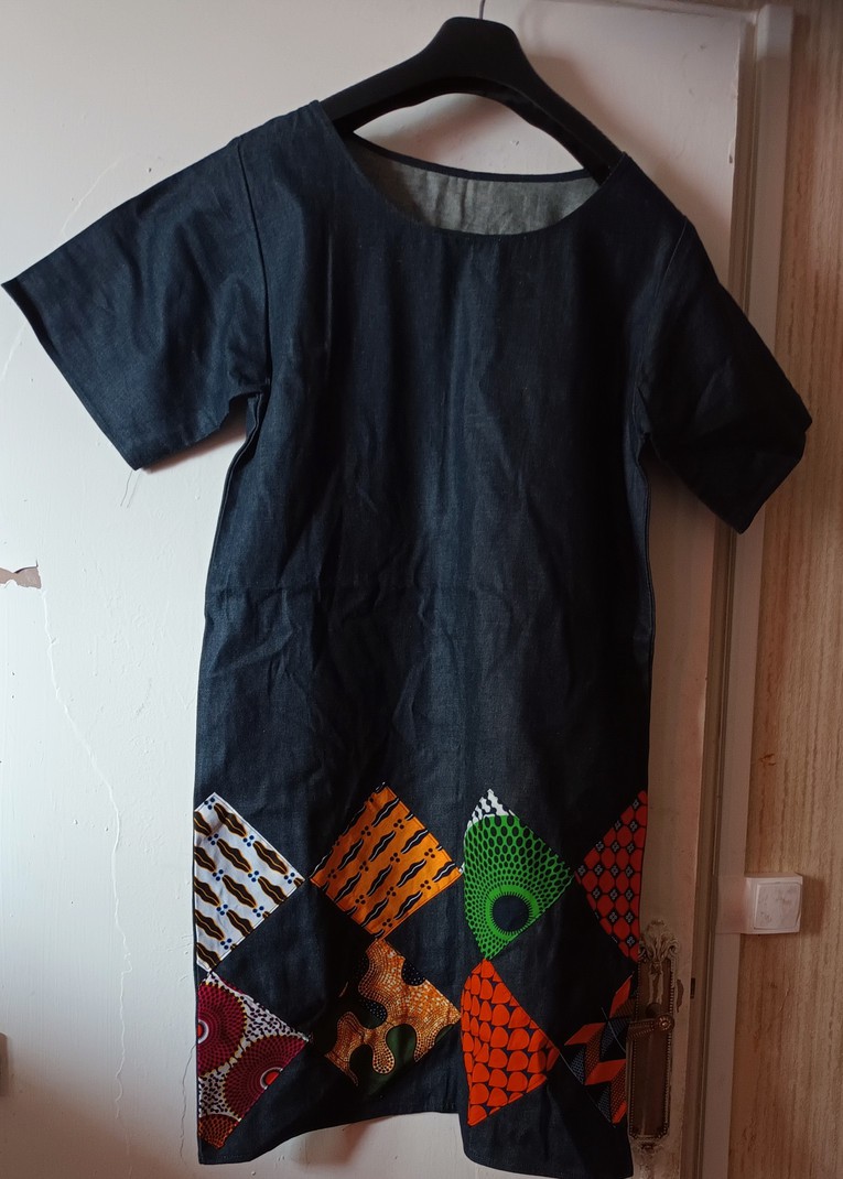 Robe.jean orné de.tissus.wax.pratique.pour.l ete