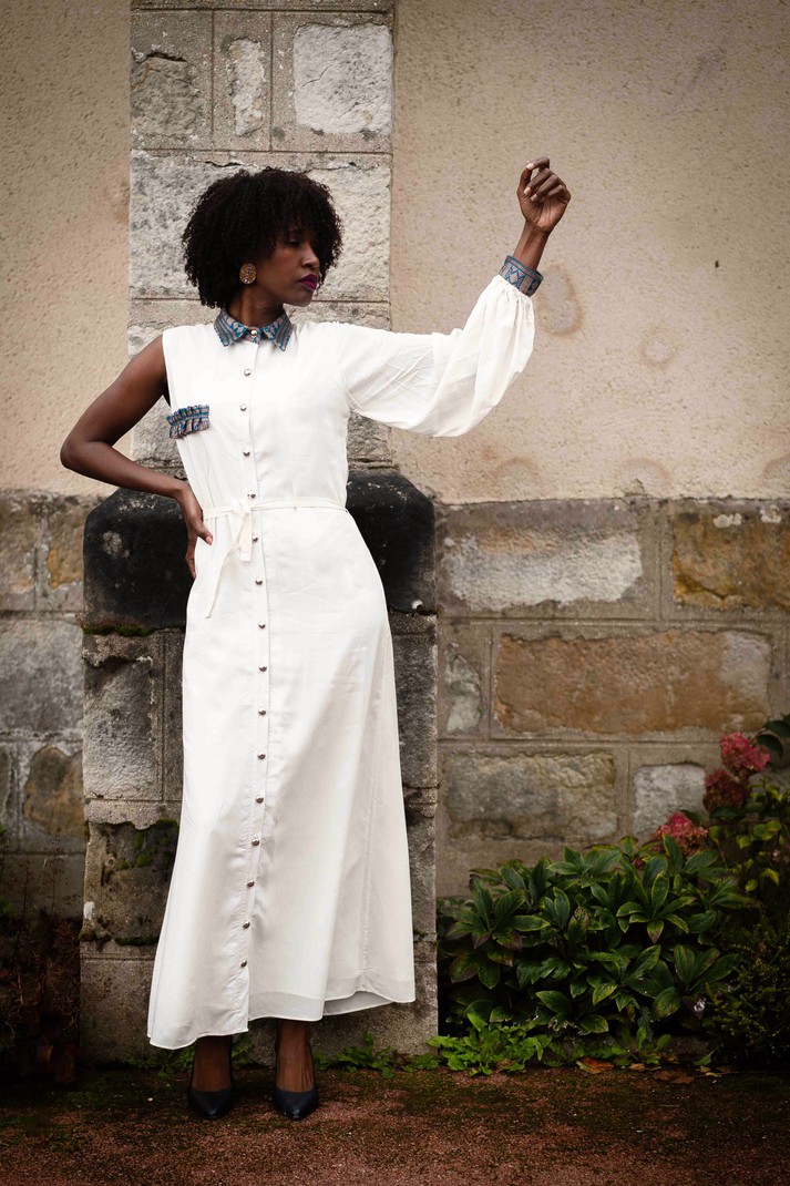 La Robe Kuddu fait partie de la collection capsule "Disruptives". Longue jusqu'aux chevilles, elle peut se cintrer au niveau de la taille grâce à une ceinture. Elle est sublimée au niveau du col, de la poitrine et du poignet par un pagne tissé Manjack travaillé à la main par des artisans sénégalais. Elle dispose d'une manche bouffante qui lui donne fière allure. Une dizaine de boutons en métal sont disposés sur toute la longueur.