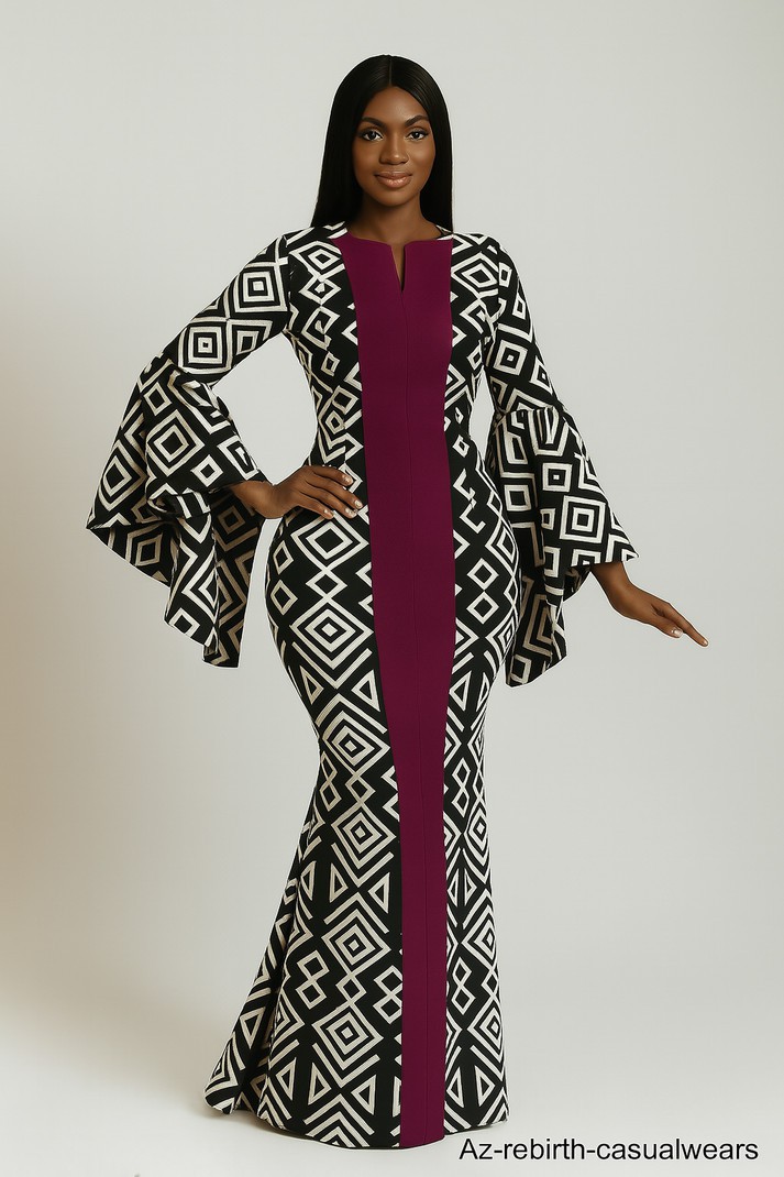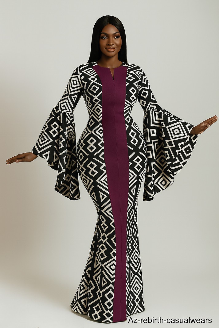 This elegant fitted maxi dress is crafted from high-quality Ankara fabric, designed to enhance the feminine silhouette with style. It features a bold geometric print and a contrast front panel that shapes the waist beautifully. The dramatic flare sleeves add a fashionable twist, making it perfect for weddings, parties, or cultural events. Available in all sizes with guaranteed fast delivery.
