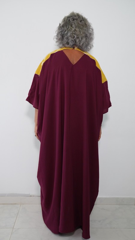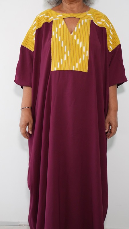 Une robe qui respire la liberté. Avec sa coupe ample et fluide, elle offre une élégance naturelle, sans contrainte. Son col en pagne baoulé, tissé selon la tradition ivoirienne, ajoute une touche de caractère subtile mais marquée.