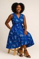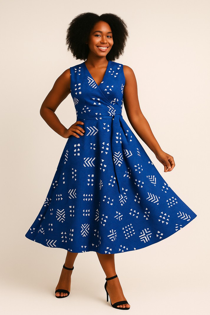 Laissez-vous séduire par cette robe portefeuille sans manches en wax bleu vibrant, sublimée par des motifs géométriques blancs.