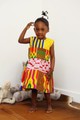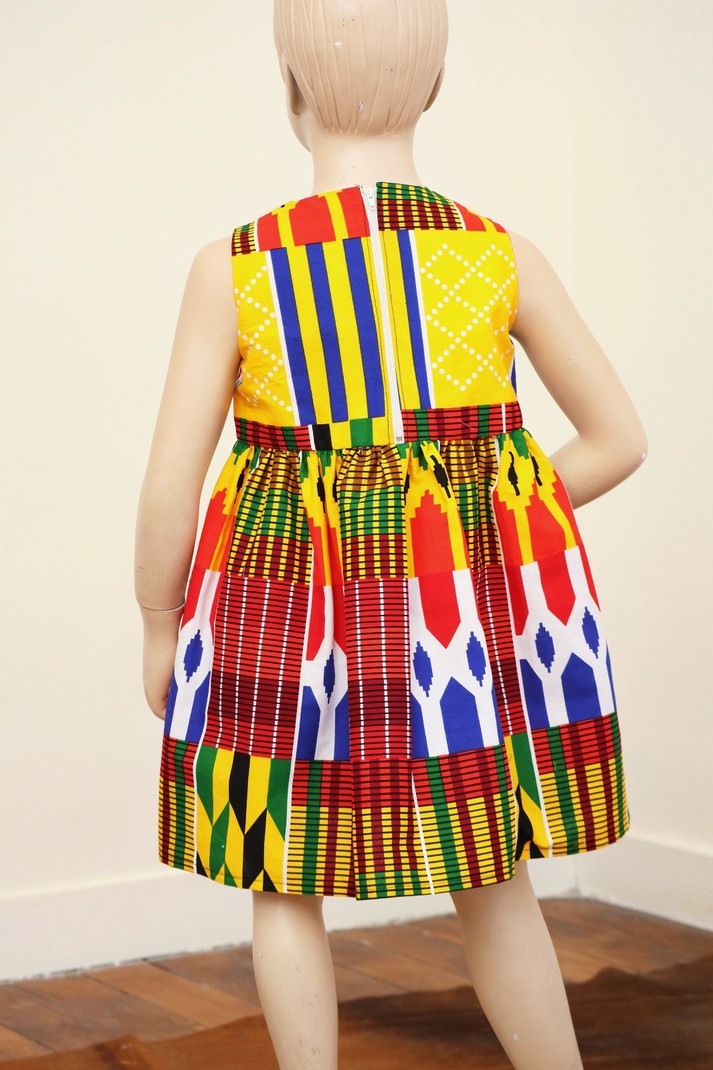 Cette petite robe d'été en coton aux imprimés wax se portera pour toutes les occasions. Dans cette création au tissu classique "Kente" votre enfant sera rayonnante. Elle est confortable avec une fermeture éclair au dos. Robe disponible en 9 - 12 mois.