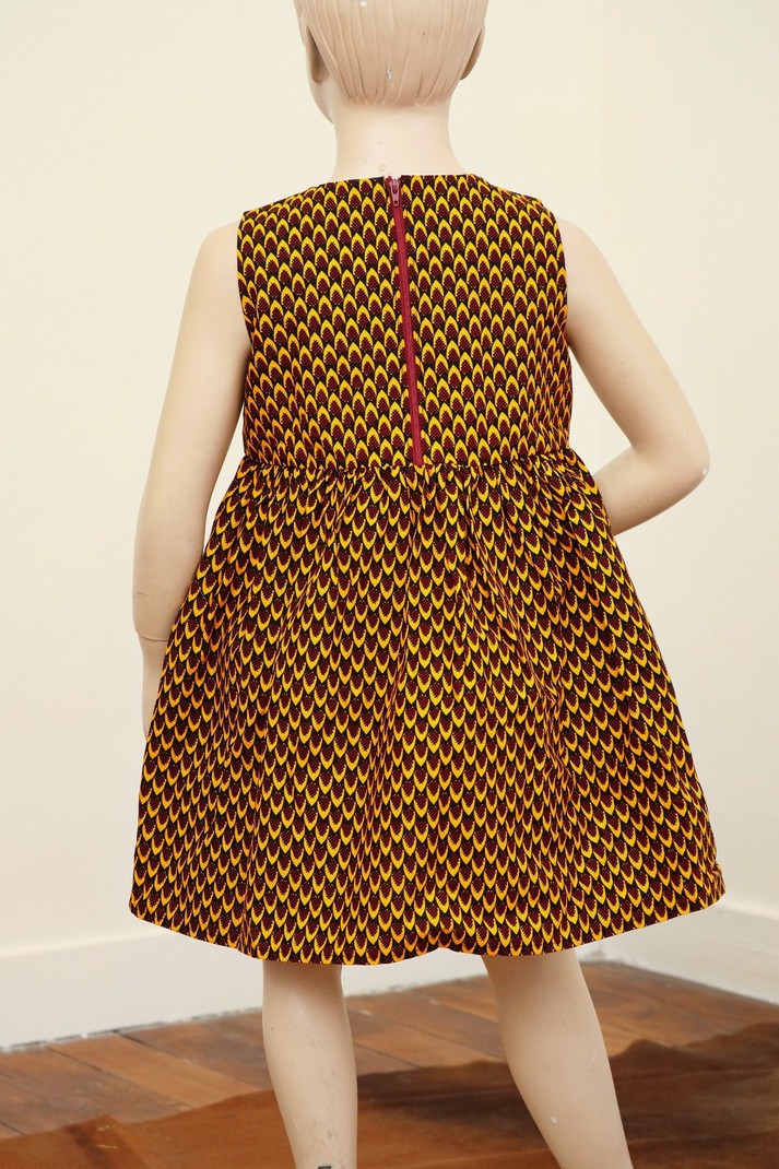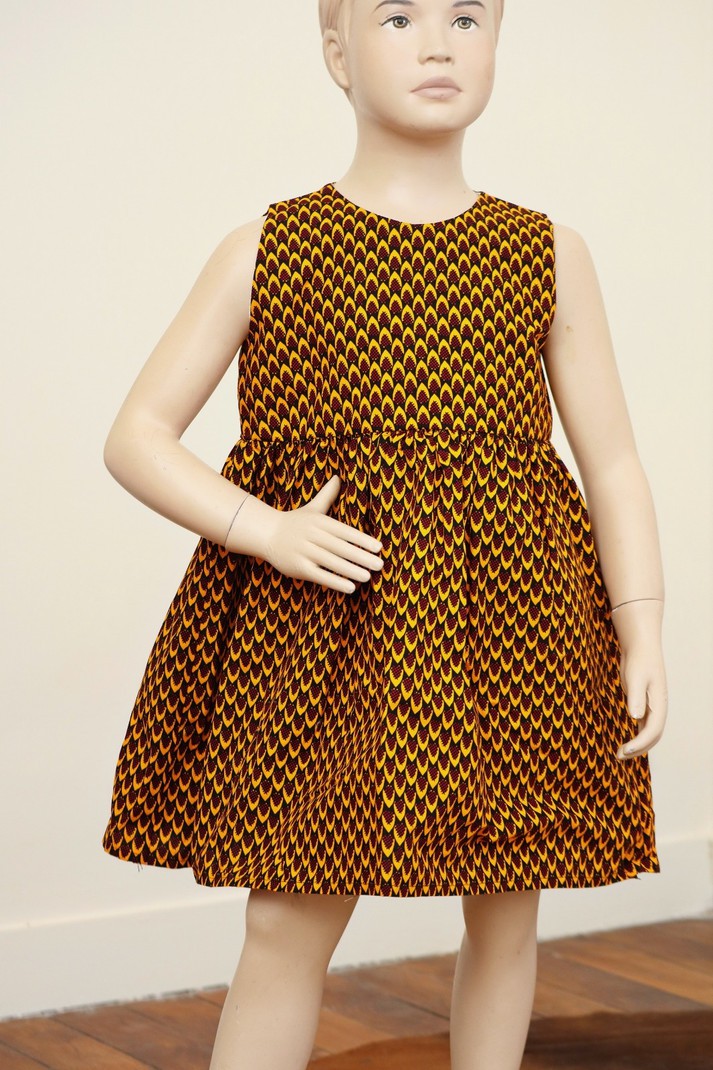 Cette petite robe d'été en coton aux imprimés wax se portera pour toutes les occasions. Dans cette création au tissu classique " écaille de tortue" votre enfant sera rayonnante.
