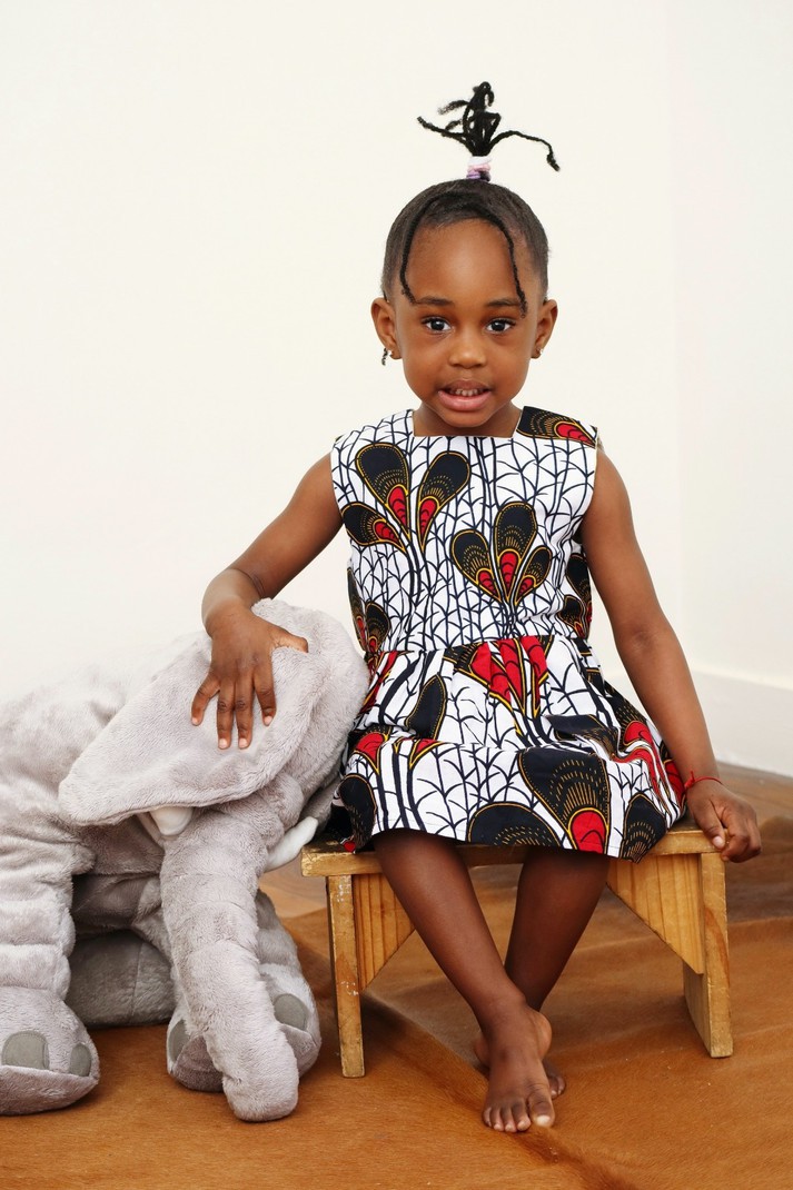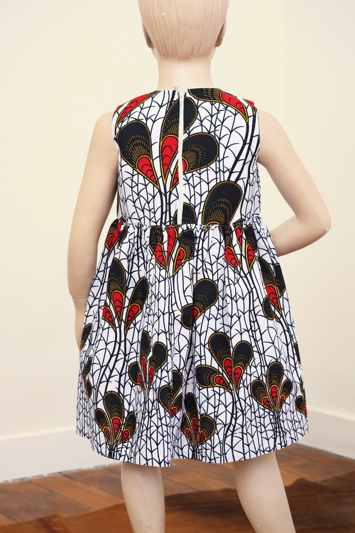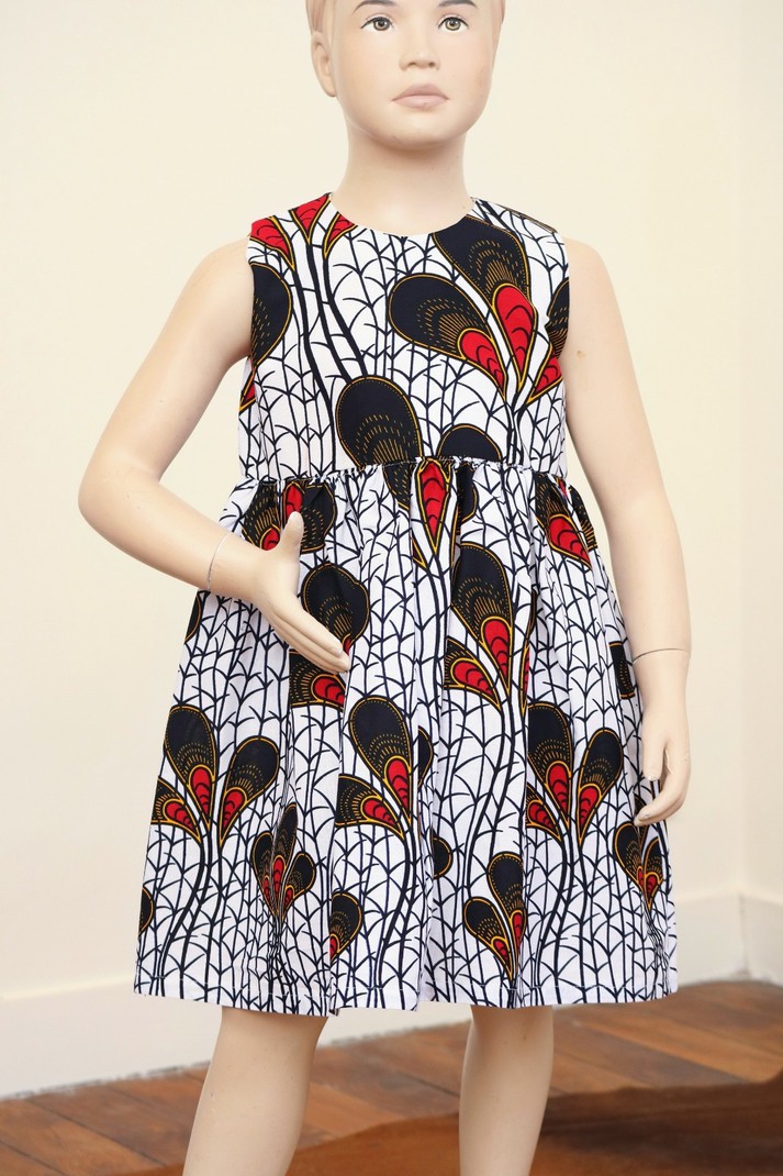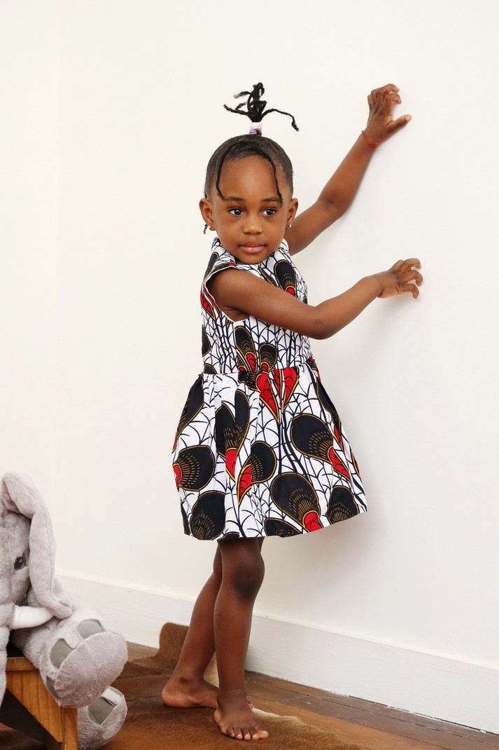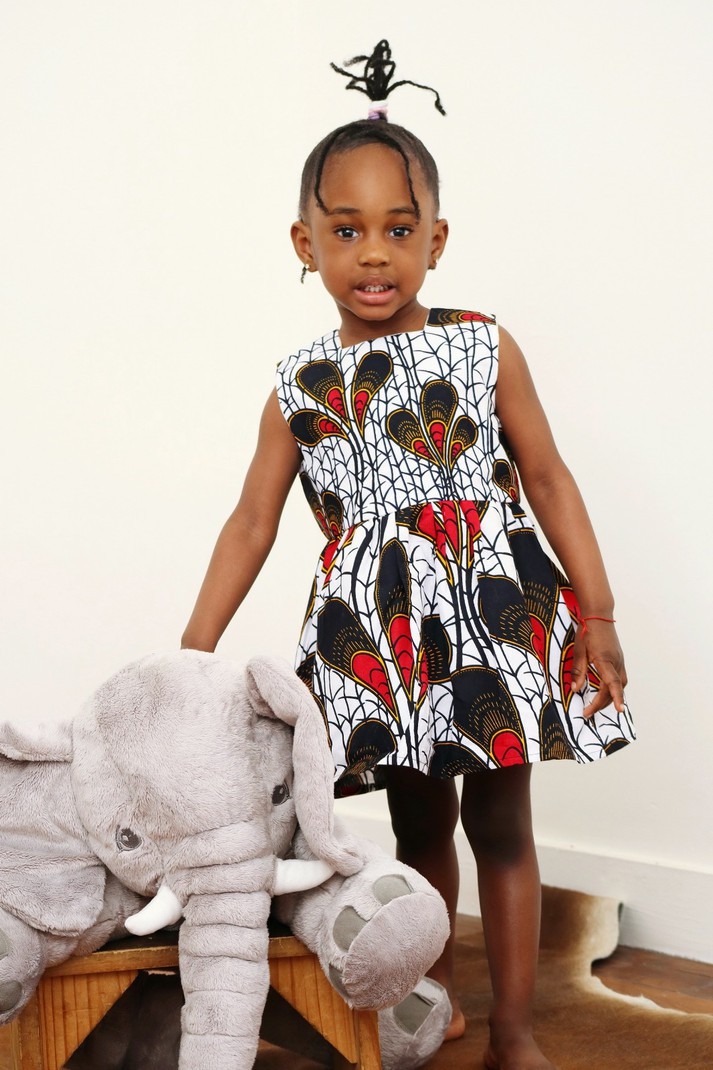 Cette petite robe d'été en coton aux imprimés wax se portera pour toutes les occasions. Dans cette création au tissu classique, votre enfant sera rayonnante. Elle est confortable avec une fermeture éclair au dos. Robe disponible en 9 - 12 mois.