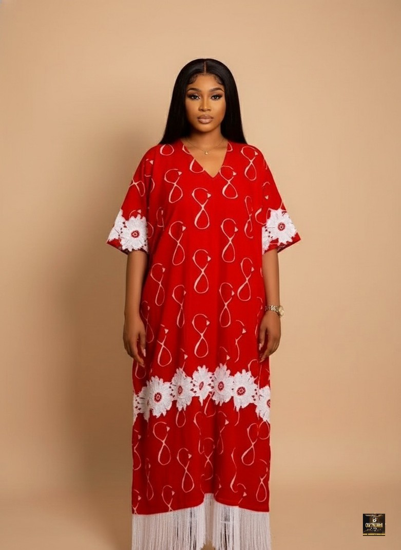 This Festive Crimson Kaftan is a striking and joyfully designed garment that perfectly marries bold color with artisanal details, offering an immediate statement piece for any collection. Crafted from a comfortable and breathable mid-weight Ankara batik fabric, the kaftan drapes beautifully while maintaining a relaxed, free-flowing silhouette. The vibrant crimson red base is adorned with delicate white looped patterns throughout, complemented by captivating borders of intricate white floral embroidery or lace trim at the knee and the edges of the short, wide sleeves. The ultimate finishing touch is the playful, densely packed white fringe hemline, which adds dynamic movement and visual interest with every step. This cheerful and relaxed piece is ideally suited for holiday celebrations, summer parties, casual gatherings, outdoor events, or stylish resort and cruise wear, promising comfort and head-turning elegance wherever it is worn.