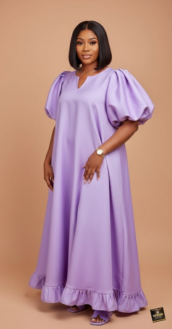This stunning floor-length lilac gown is meticulously crafted from a premium crepe blend, offering a smooth, lustrous finish that drapes beautifully over the body. The design features a contemporary split-neckline and dramatic, voluminous puff sleeves that add a touch of regal flair, while the bottom is finished with a playful ruffled hem for added movement. To complete this high-fashion look, the model is styled with a sophisticated gold chain wristwatch that perfectly complements the soft purple hue of the fabric. This elegant silhouette is an ideal choice for formal evening receptions, high-profile galas, or festive religious ceremonies where you want to make a graceful and memorable impression.