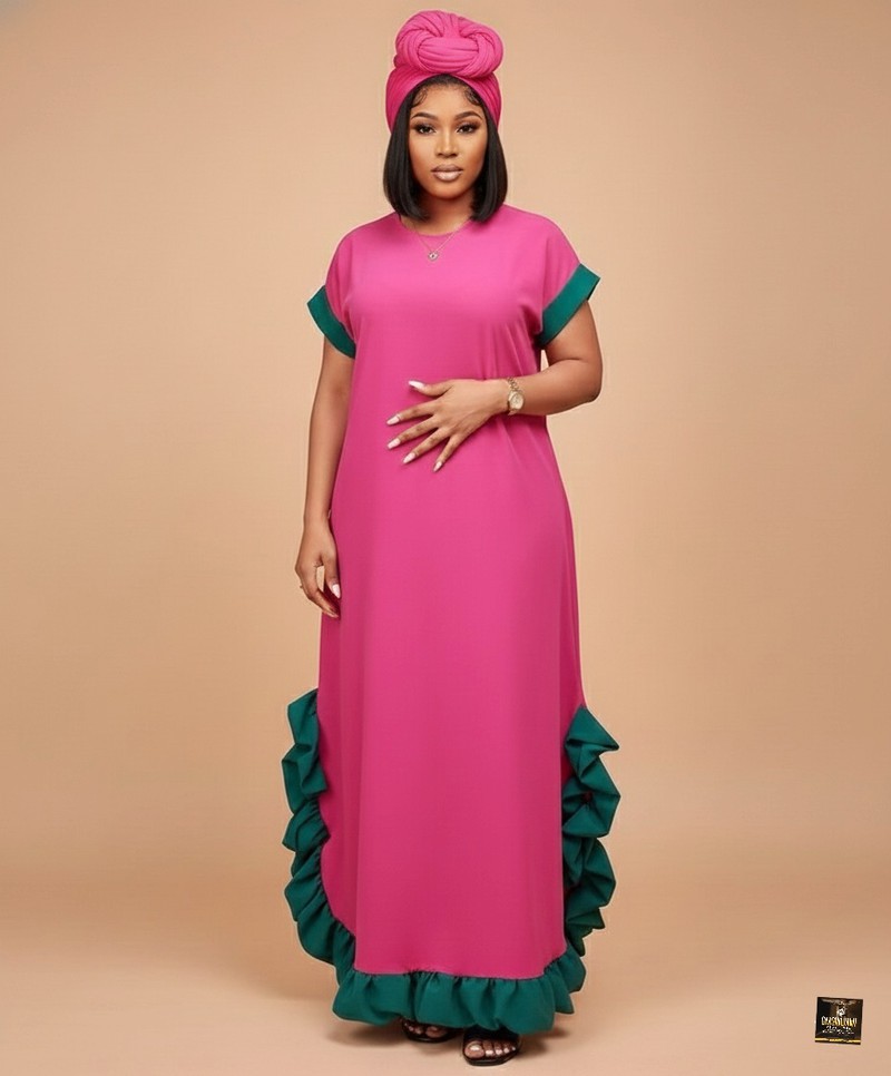 This striking floor-length maxi dress is expertly crafted from a high-quality crepe fabric in a rich magenta pink, offering a smooth, structured drape that maintains its elegant shape throughout the day. The design is uniquely elevated by bold, emerald green pleated ruffle accents that frame the sides and hemline, creating a sophisticated color-blocked aesthetic that is mirrored in the contrasting sleeve cuffs. Accessorized with a matching pink headwrap and a refined gold chain wristwatch, this vibrant ensemble is an ideal choice for high-profile cultural events, elegant dinner parties, or festive religious celebrations where you want to showcase a bold and regal style.