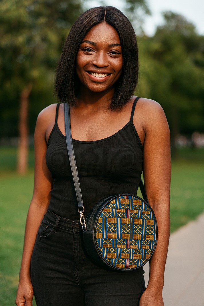 This Round Shoulder Bag in beautiful African Kente design is the perfect addition to your wardrobe. With its lightweight and versatile sling style, it is perfect for carrying all your essentials while adding a touch of cultural flair. Elevate your style and make a statement with this unique and eye-catching bag!