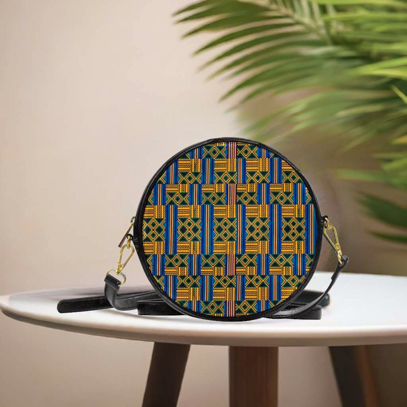This Round Shoulder Bag in beautiful African Kente design is the perfect addition to your wardrobe. With its lightweight and versatile sling style, it is perfect for carrying all your essentials while adding a touch of cultural flair. Elevate your style and make a statement with this unique and eye-catching bag! Product Description * 8.22 Oz. Made from high-grade PU leather. * Single zippered round closure. * One main compartment, big enough to pack cosmetic, sunglasses, Phone and etc. * Adjustable PU leather shoulder strap for easy and comfortable carrying. * Dimensions: 8.07"(L) x 2.07"(W) x 8.07"(H). Delivery Time This item will be processed within 3-7 business days (Excluding Weekends and Holidays). Once products ships it can take up to 15 Business days depending on your location. Out of Stock items can be requested by emailing us at [email protected] Care Instructions Machine wash cold inside out. Gentle cycle with mild detergent and like colors. Do not use bleach or fabric softener. Do not tumble dry. Hang to dry to ensure maximum shelf life. Iron inside out if necessary. Do not iron the print. Do not dry clean.