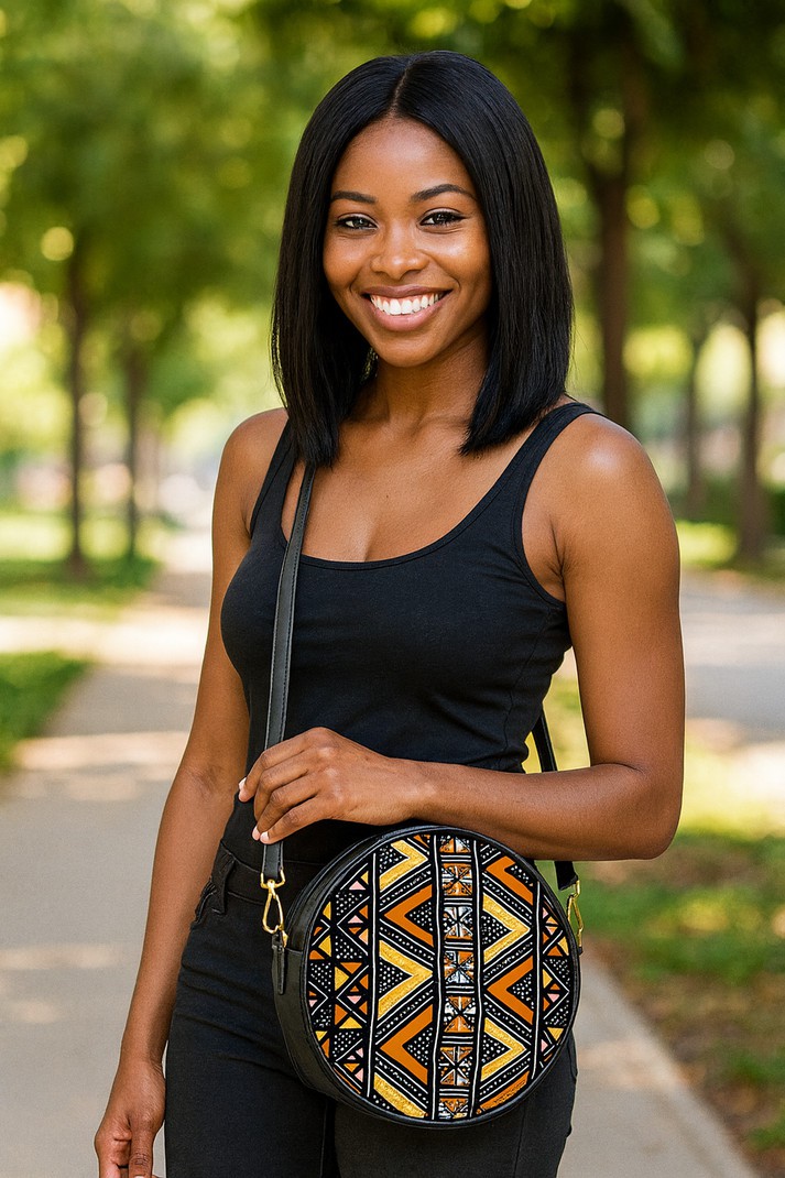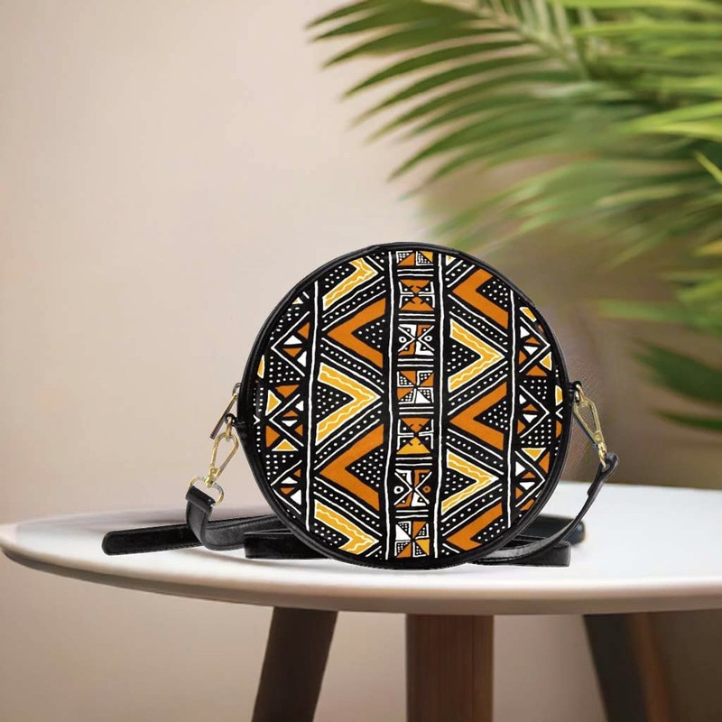 Experience the vibrant and unique design of our Round Sling Bag African Mud Cloth Design. This stylish and functional bag is perfect for carrying all your essentials comfortably with its adjustable strap and spacious interior. The African mud cloth design adds a touch of culture and personality to your look. Elevate your style today with this one-of-a-kind bag!