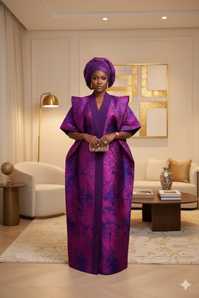 Make a breathtaking entrance with this royal purple luxury brocade boubou gown, designed for women who love elegance, confidence, and rich texture.