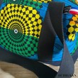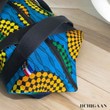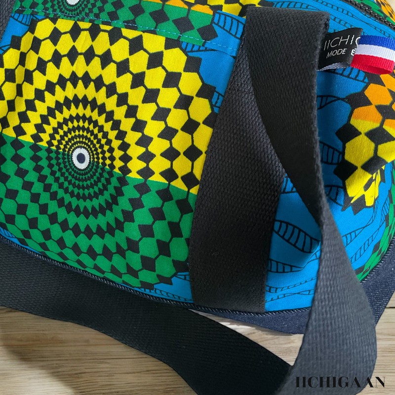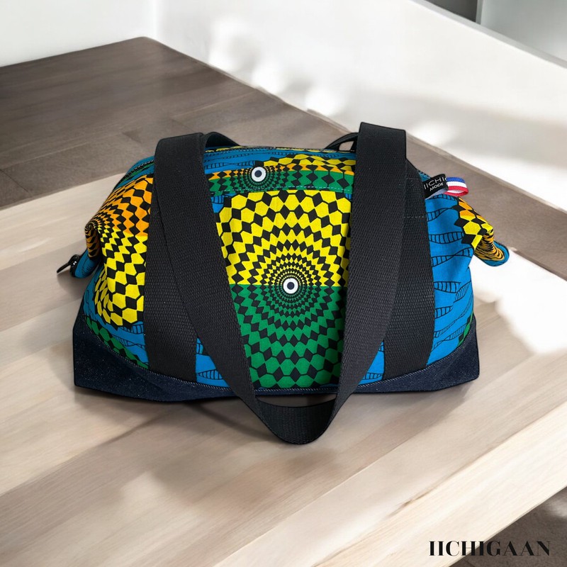 Ce sac de voyage a été réalisé en tissu wax et en jean denim.
