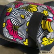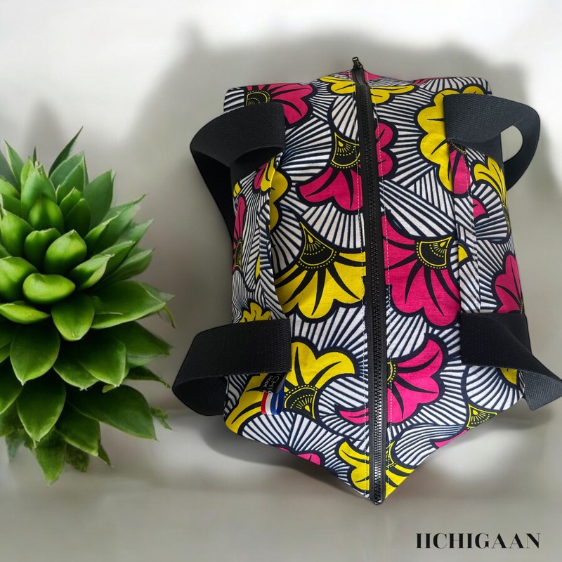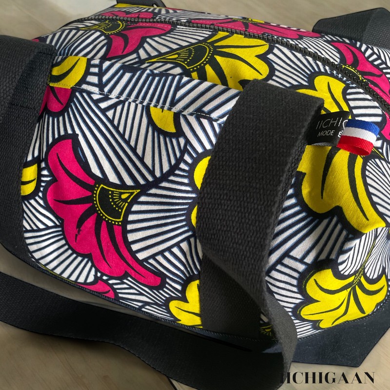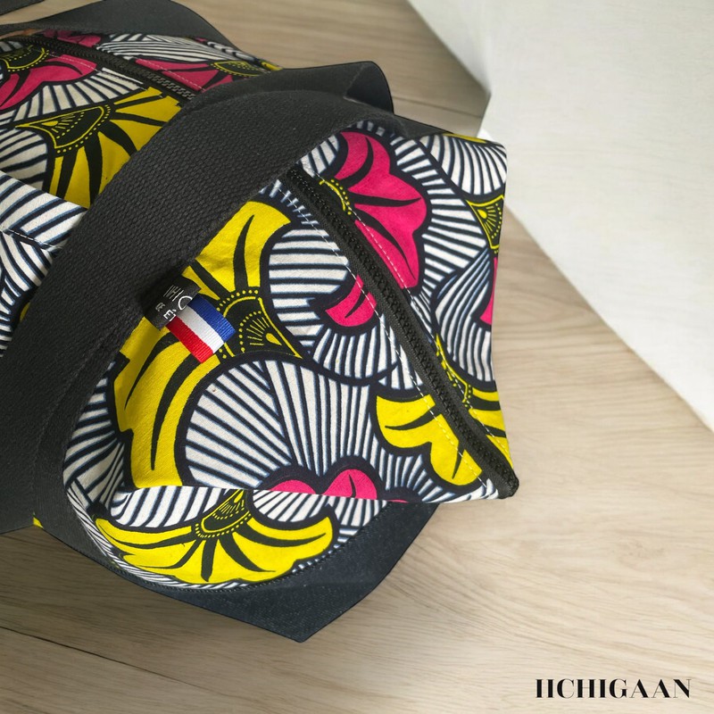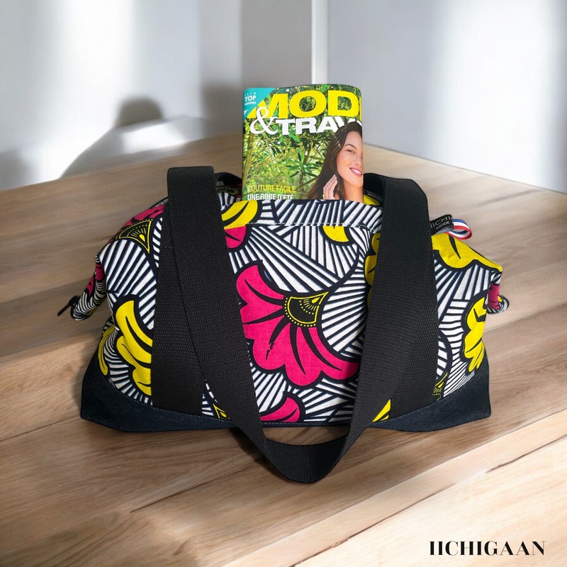 Ce sac de voyage a été réalisé en tissu wax et en jean denim.