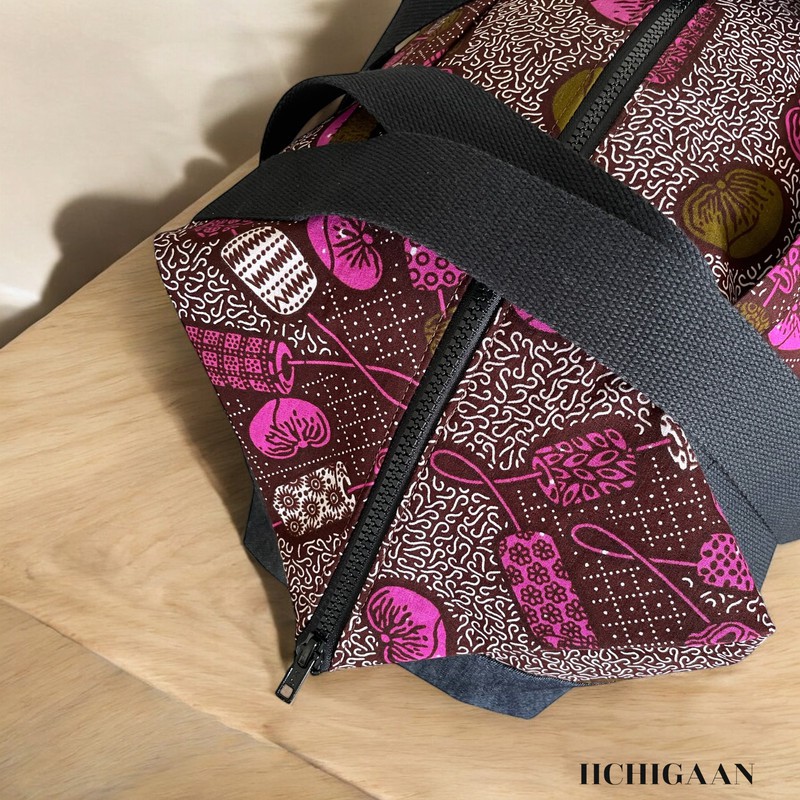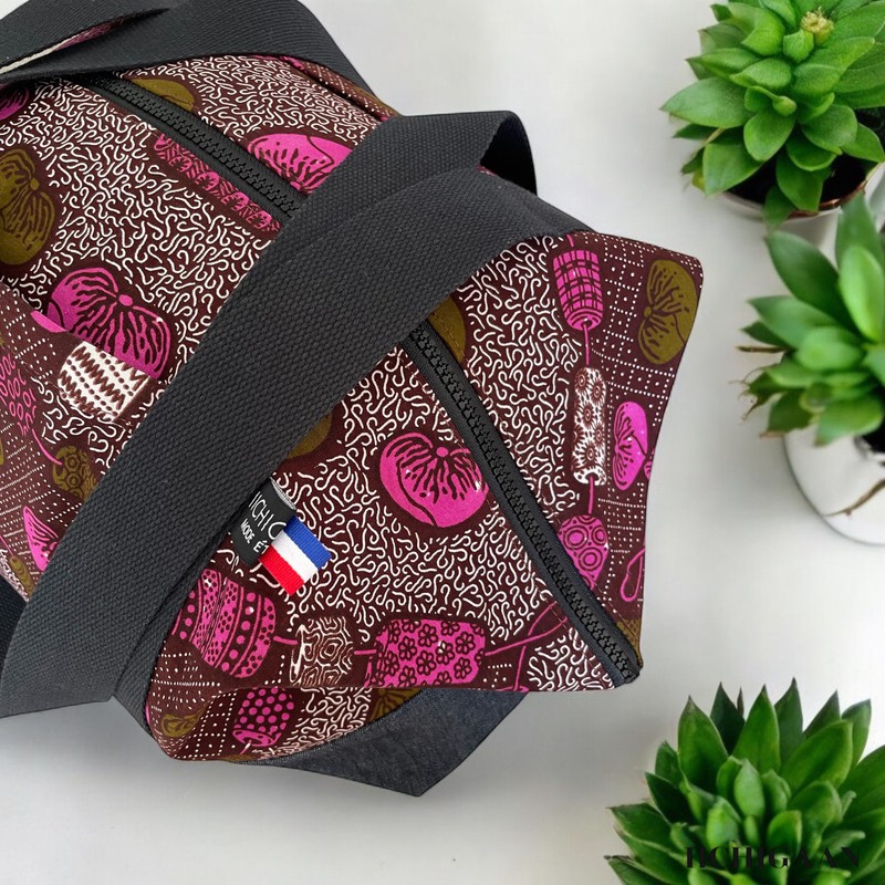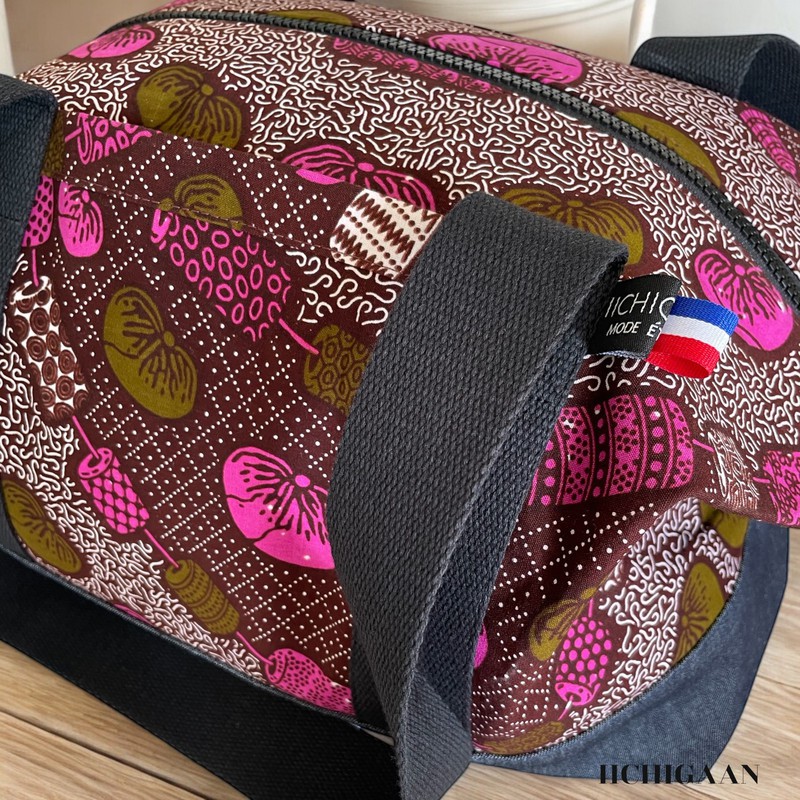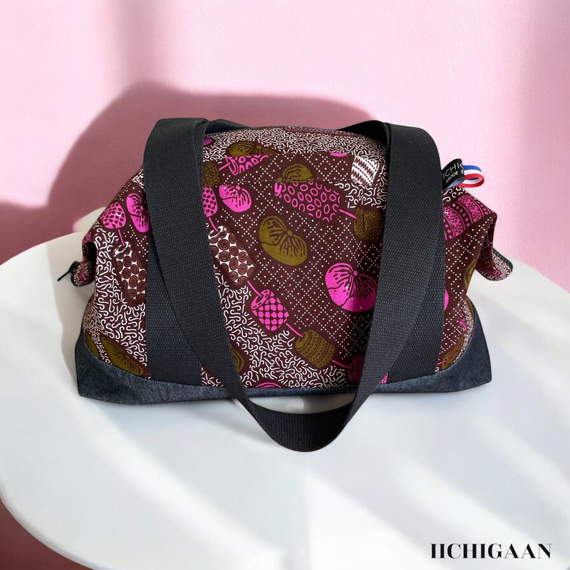 Ce sac de voyage ou grand sac week-end a été réalisé en tissu wax et en jean denim.