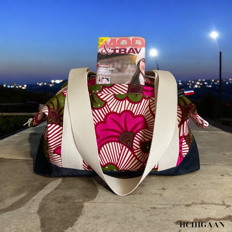 ***NOUVELLE COLLECTION*** Ce sac de voyage ou grand sac week-end a été réalisé en tissu wax et en jean denim. Le sac est entièrement doublé de coton et possède une poche intérieure plaquée pour y ranger votre téléphone ou vos clés… Anses de portage principale ou épaule en sangle de coton. Deux poches extérieures de rangement. La base extérieure du sac est en jean denim. Dimensions du sac : *Hauteur : 30 cm *Profondeur : 18 cm *Longueur : 57 cm