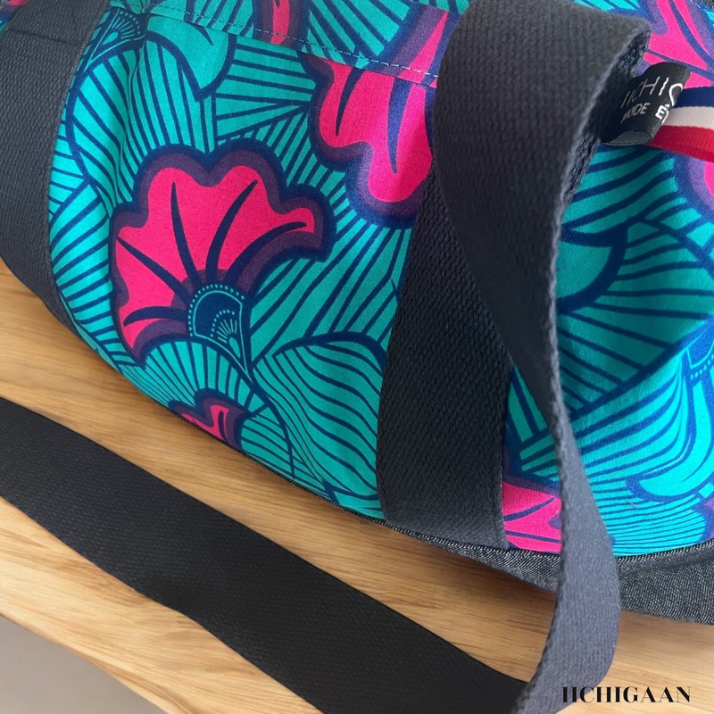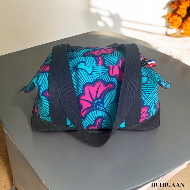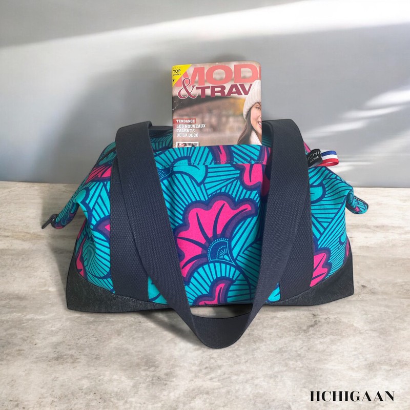 Ce sac de voyage a été réalisé en tissu wax et en jean denim.
