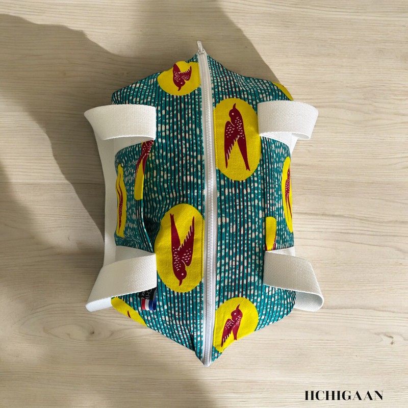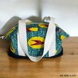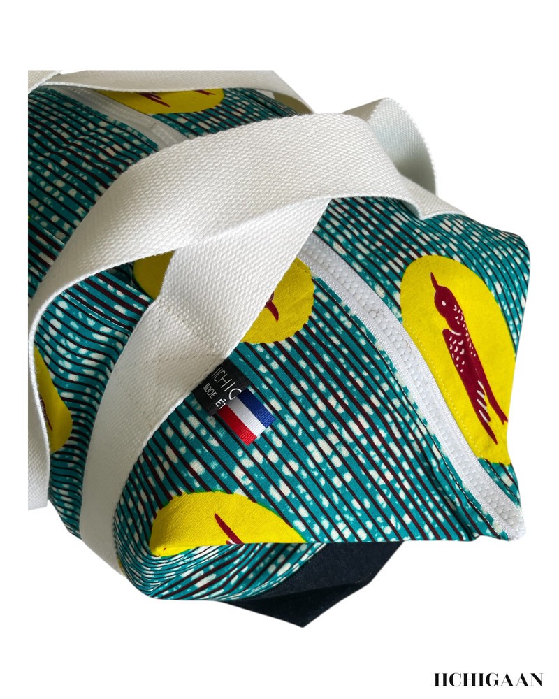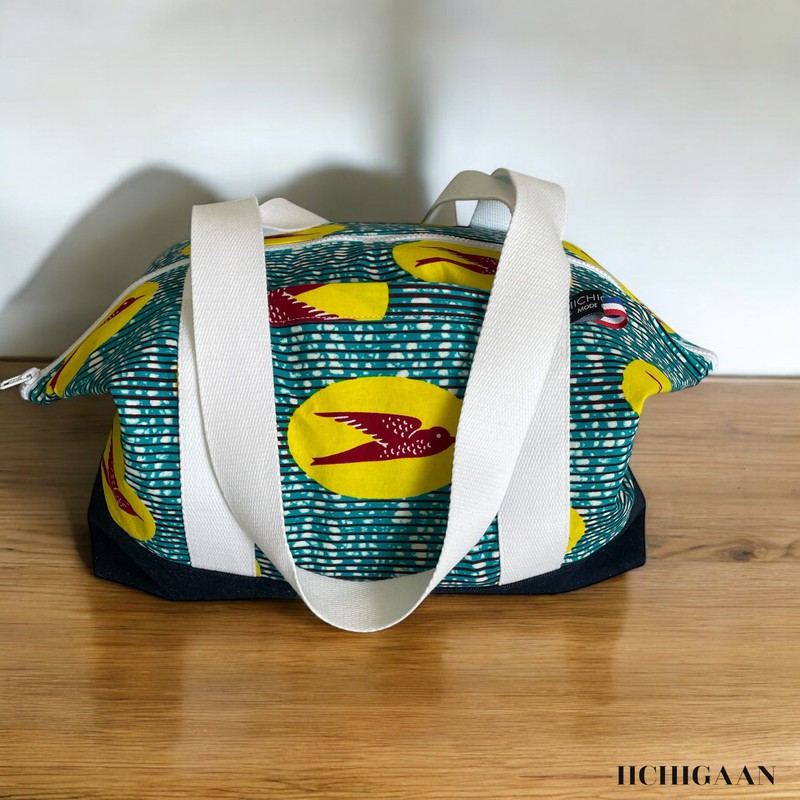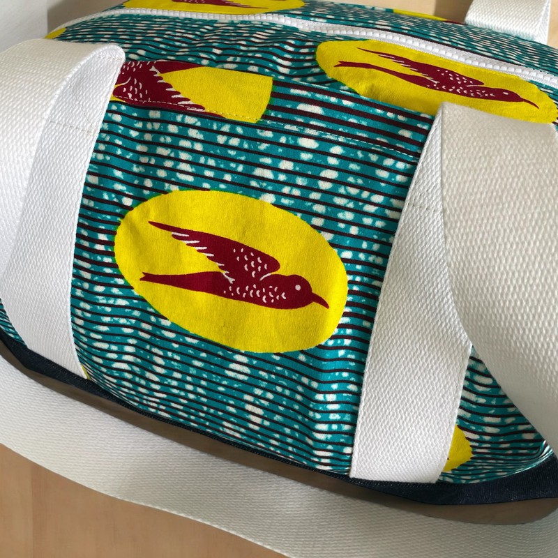 Ce sac de voyage ou grand sac week-end a été réalisé en tissu wax et en jean denim.