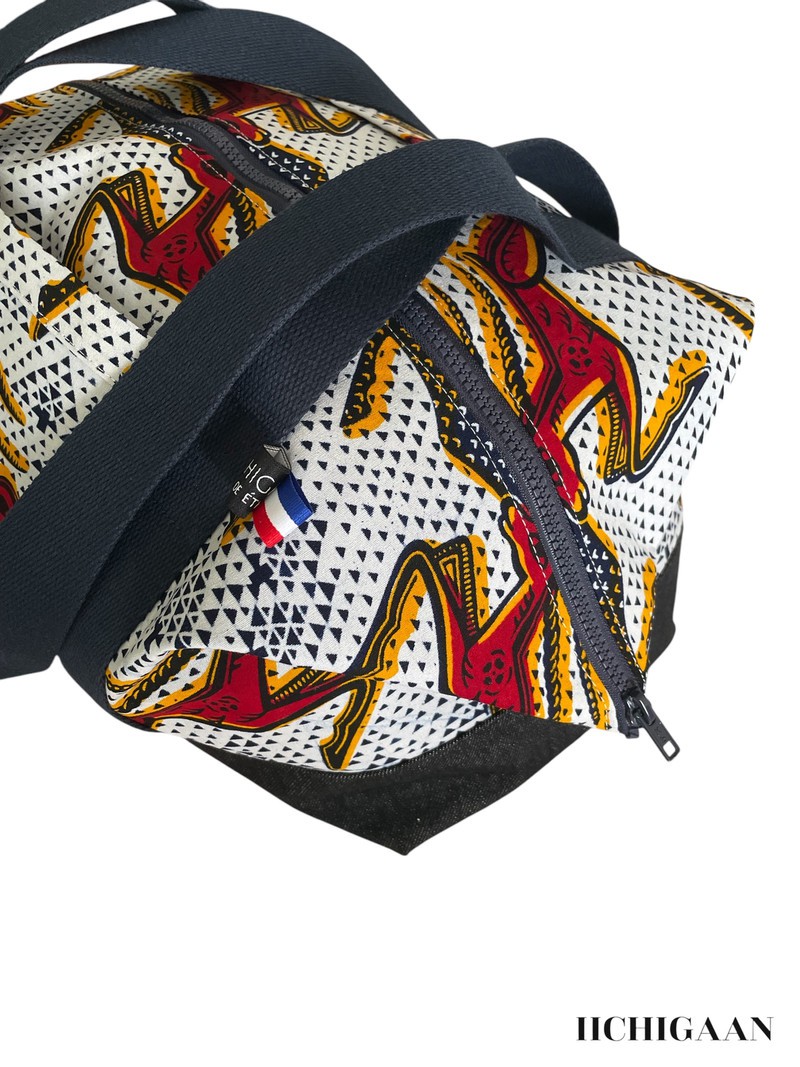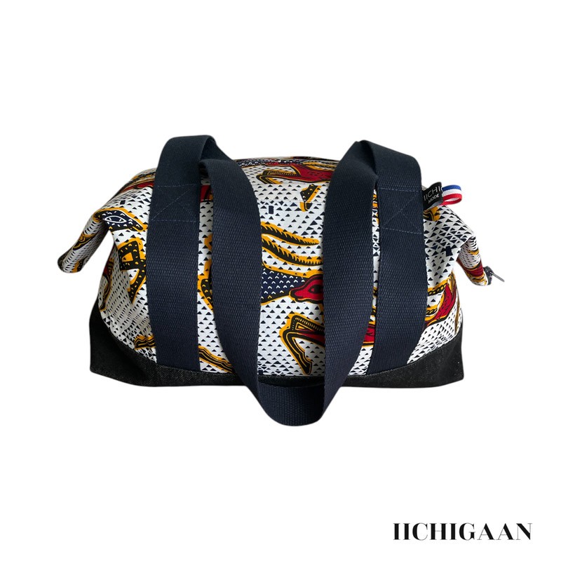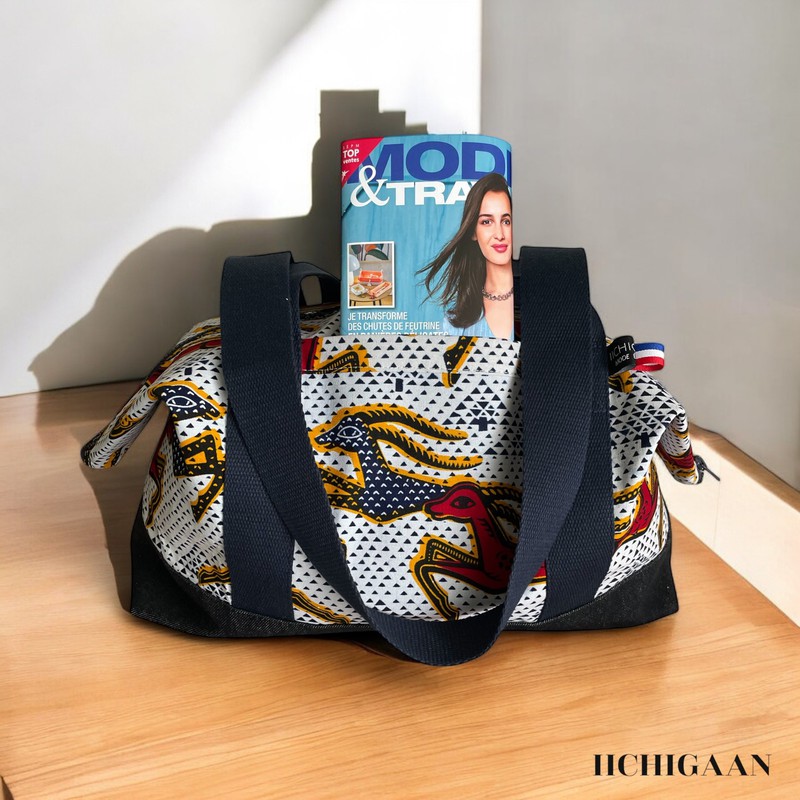 Ce sac de voyage ou grand sac week-end a été réalisé en tissu wax et en jean denim.