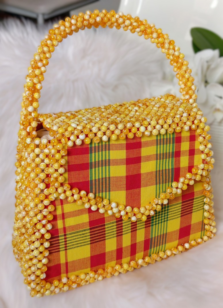Bags Hand bags name_en: Yellow name_en: Beads name_en: Madras Fabric