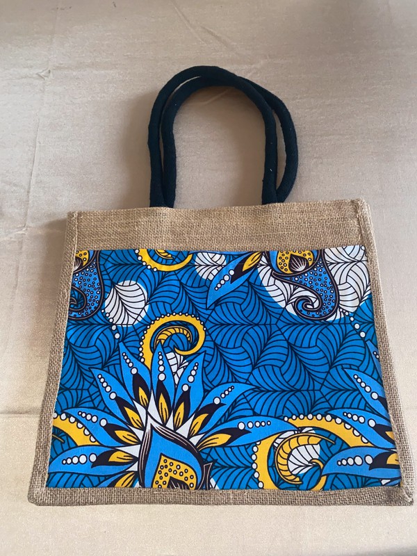 Sac en toile de jute personnalisé avec une poche en tissu inspiré de l'Afrique. Idéal pour le quotidien, le travail, ou encore les balades au parc. Il deviendra votre nouveau compagnon de route ! Dimensions : Longueur 36 cm Largueur 33 cm Profondeur 19 cm Peut aussi servir de sac de courses ou sac de plage