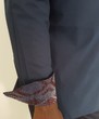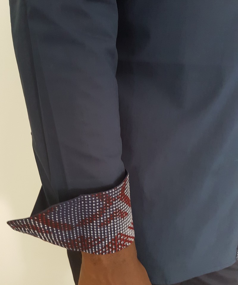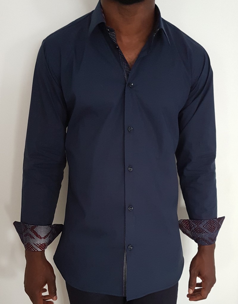 Chemise bleu nuit en coton avec une touche de wax (intérieur du col, fermeture et revers des manches)