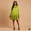 Step into a fairytale with this ethereal Satin dress. The unique chartreuse-green color glows against the skin. The dress features an oversized, tent-style silhouette with billowy puff sleeves and a gathered tiered hem. It is romantic, playful, and undeniably high-fashion.