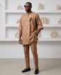 This premium two-piece set redefines African men's traditional wear with a clean, contemporary aesthetic. Crafted from a high-quality tan/camel brown fabric, the suit offers a comfortable yet sharp tailored fit perfect for any formal or semi-formal event.