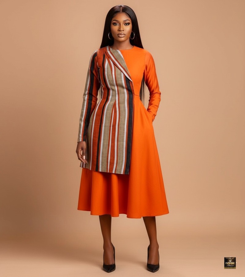 Make a bold, warm statement in this vibrant full-orange midi dress. The classic A-line silhouette is revitalized by an asymmetric panel of multi-colored striped fabric across the bodice and one shoulder, reminiscent of a wrap blouse. The long sleeves and comfortable cut make it a sophisticated choice for office wear, professional luncheons, or semi-formal daytime celebrations.