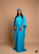 This striking, floor-length kaftan showcases a vibrant, refreshing hue of cyan blue, crafted from a smooth, flowing fabric that ensures a luxurious and comfortable drape. The silhouette is expansive and gracefully loose, featuring wide, short sleeves that contribute to the garment's airy, relaxed structure. The most distinctive feature is the centralized V-neck yoke, which is beautifully embroidered with a fine, textured grid pattern in bright white and lighter blue threads, creating an appealing geometrical focus against the solid background. This intricate pattern introduces a sophisticated, modern contrast to the traditional, modest cut. Completing this cohesive ensemble is a coordinating fabric turban in the same bright blue, offering a ready-to-wear, polished look ideal for fest.