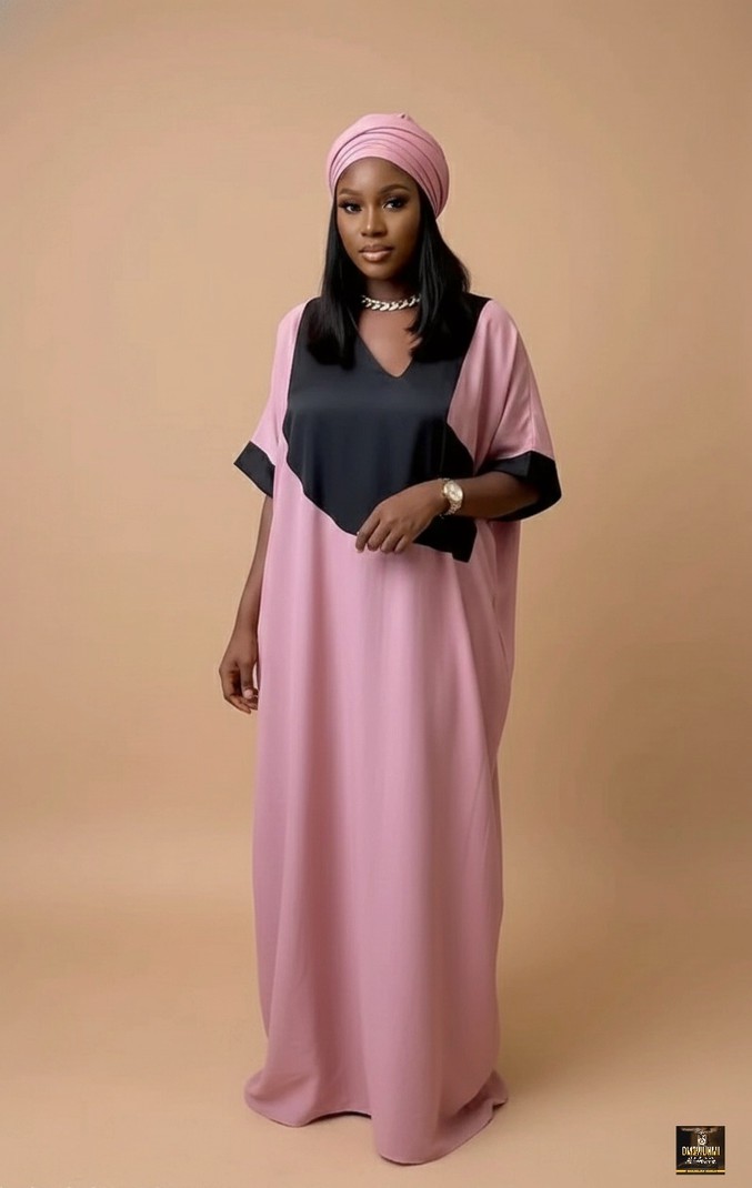 This chic, floor-length kaftan offers a sophisticated contemporary design by skillfully blending two contrasting solid colors in a sleek, flowing silhouette. The main body of the dress is crafted from a smooth fabric in a lovely, muted soft pink hue, ensuring a comfortable and elegant drape. The wide, loose-fitting silhouette is accentuated by short sleeves, which are finished with a neat border of black fabric, echoing the contrasting yoke detail. The most striking feature is the asymmetrical upper bodice panel, where a large diagonal block of rich, solid black fabric, intersects the pink, forming a dynamic V-neckline and providing a modern, graphic focal point. This fusion of soft color and sharp black detailing creates a polished, versatile garment, perfectly finished with a coordinated pink fabric turban for an elevated, modest look.