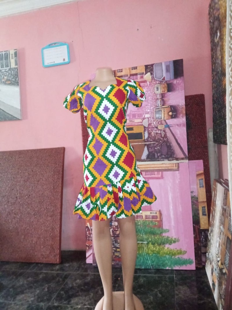 Short asymmetric dress, fitted bodice and pleats. Made with high quantity cotton Kente fabric. Can be worn on dates and for different occasions like birthday.