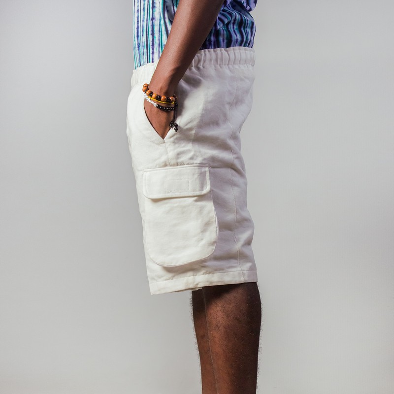Short en pagne tissé blanc avec poches cargo. Confectionné à Lomé, TOGO. Également disponible en noir et bleu marine. Chaque pièce de cette collection a été réalisée à partir de bandes de pagne tissé qui ont été brodées les unes unes aux autres. Le mais du procédé étant de consolider l'assemblage des bandes tout en rajoutant une touche esthétique et d'unicité à chaque pièce.