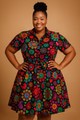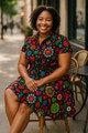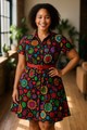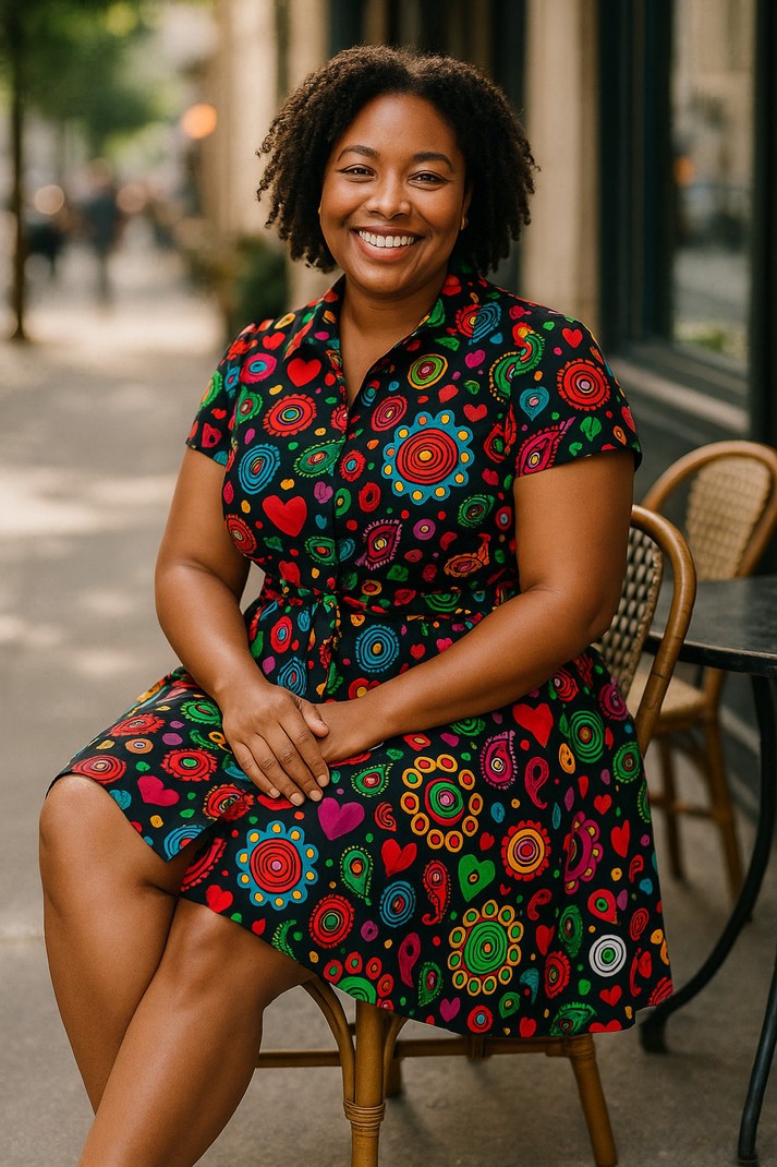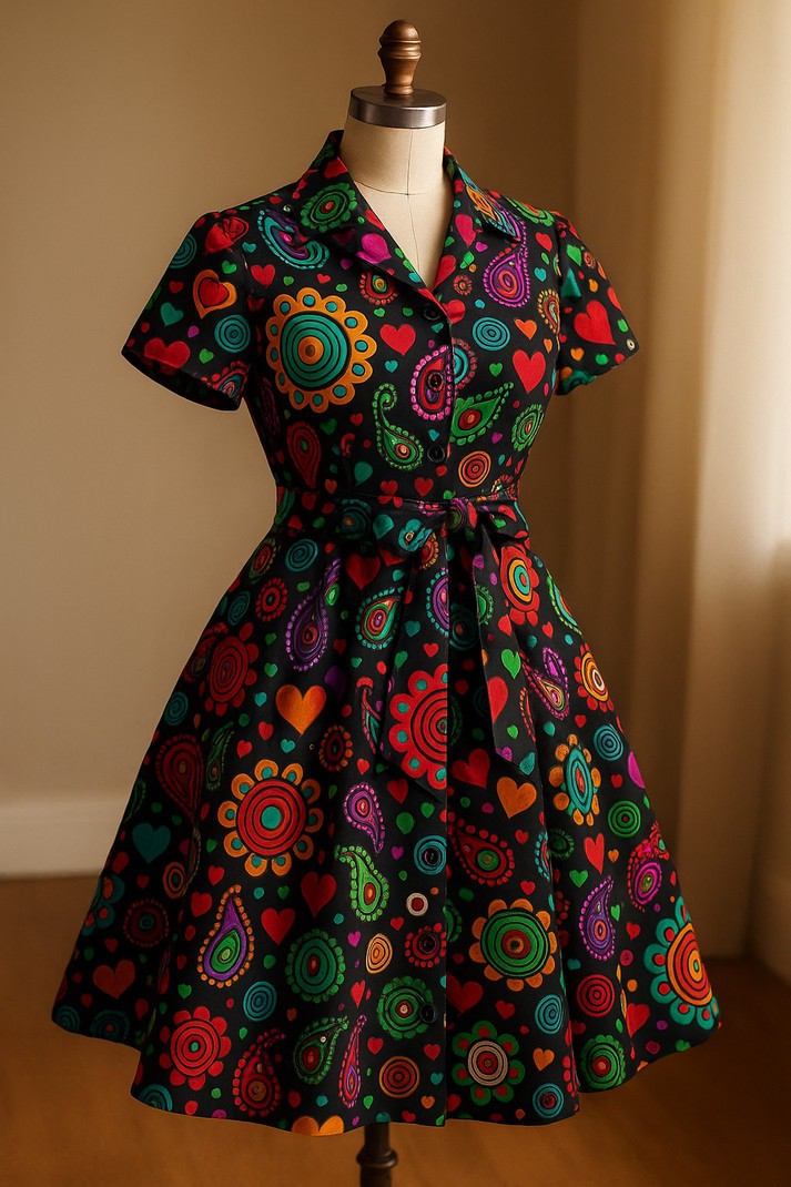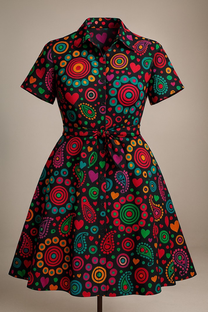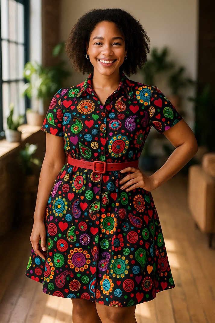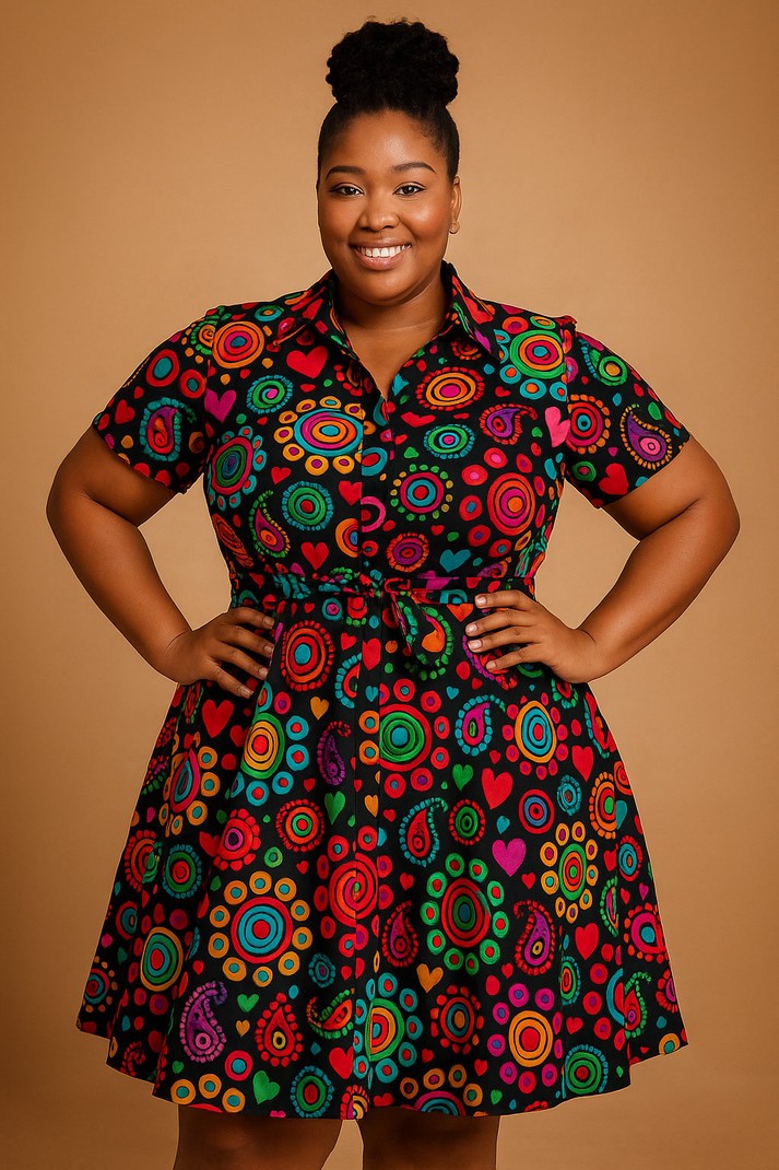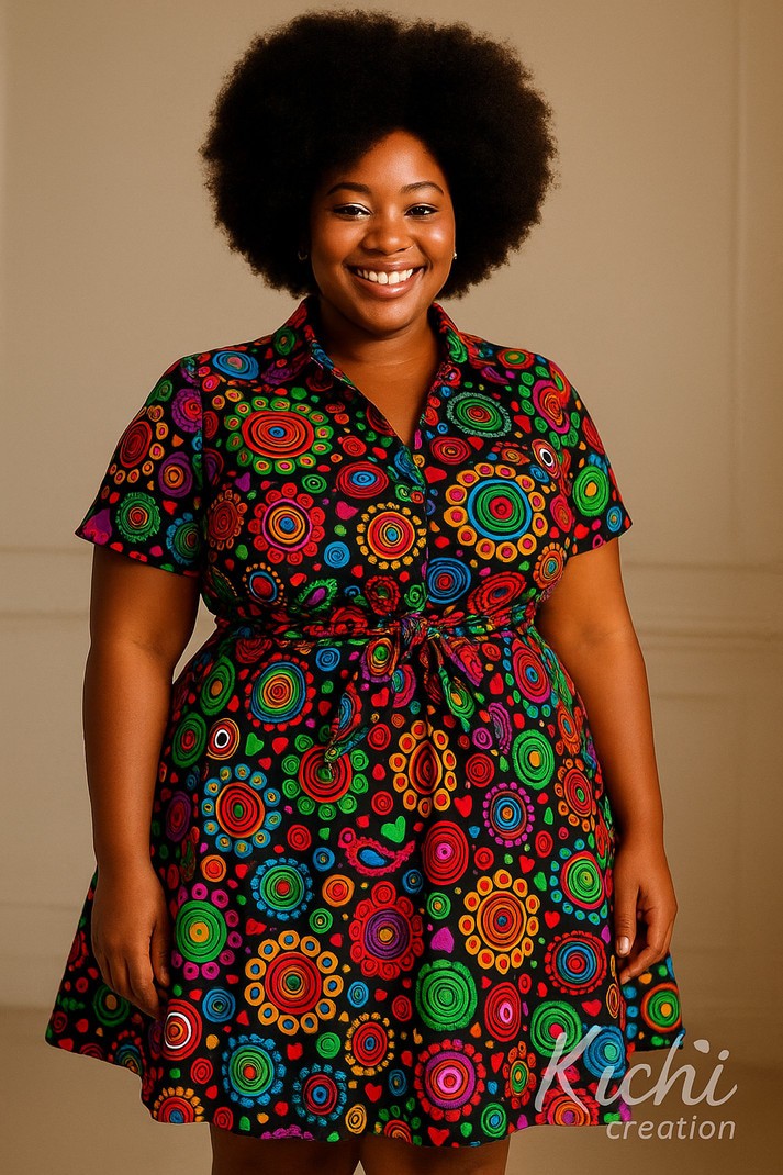 Apportez de la joie à votre garde-robe avec cette robe chemisier évasée, confectionnée dans un somptueux tissu wax aux motifs circulaires et vibrants. Son imprimé hypnotique mêle des teintes éclatantes de rouge, vert, jaune, bleu et violet sur fond noir, créant un effet dynamique et original.