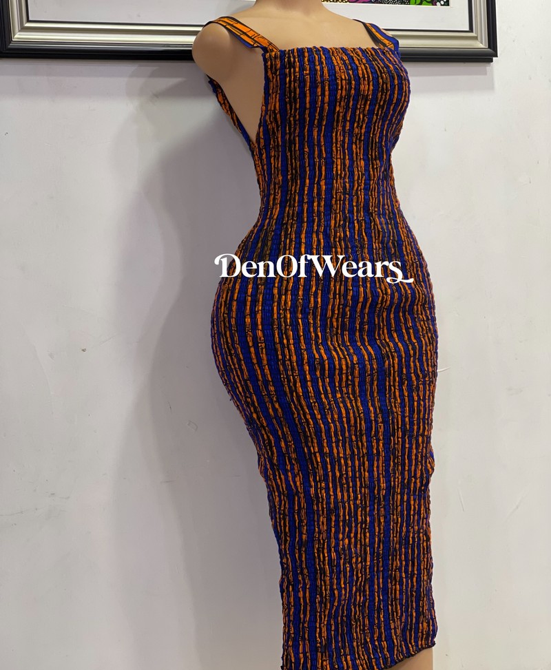 sleeveless smocked mid length Ankara dress. Bodycon African print dress. Blue Ankara dress