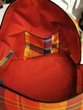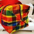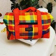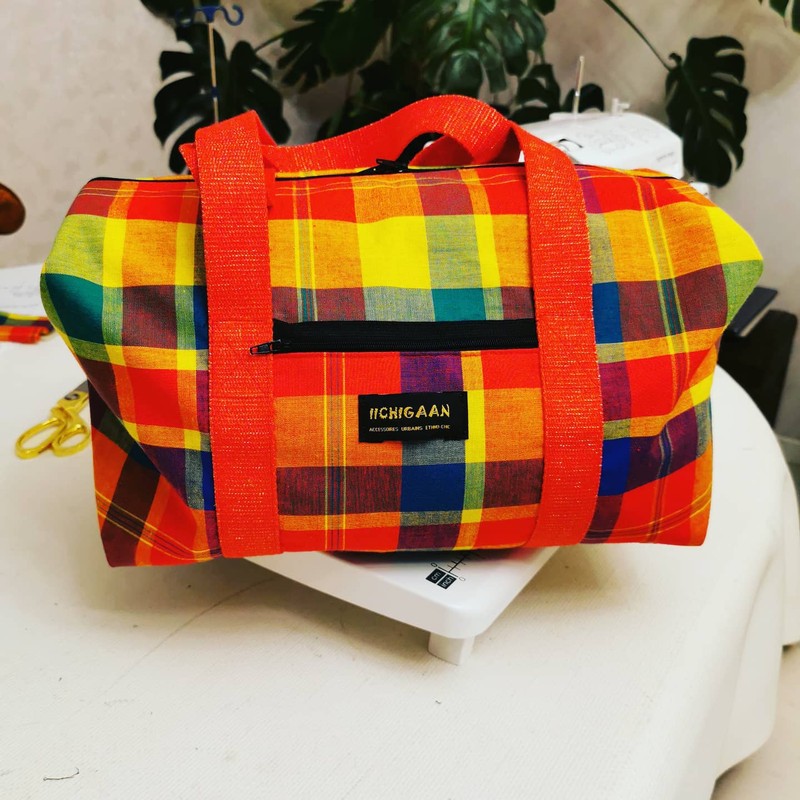 This bag was made in madras fabric and cotton. The bag is fully lined with cotonade and has an internal patch pocket. Lurex strap carrying handles. Zipped outside pocket. Double slider closure. Folding of the original origami sides. Good countenance. Ideal as a sports bag. Light but resistant texture!