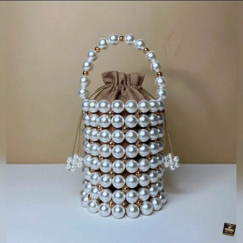 Presenting a captivating blend of texture and timeless elegance, this structured bucket bag is a luxurious statement piece that beautifully reinterprets classic pearl design. The cylindrical body features a rigid, external cage meticulously crafted from uniform rows of large, lustrous faux pearls, with each tier separated by shimmering metallic gold spacer beads that add a luxurious contrast and depth. This shimmering shell beautifully frames the visible interior—a soft, gathered drawstring pouch made from a textured, neutral-toned fabric like jute or linen, which cinches closed with thin cords ending in delicate pearl cluster accents. Finished with a matching rigid pearl and gold top handle, this bag is perfectly suited for bridal events, resort wear, or simply infusing any ensemble with a touch of refined glamour and sophisticated romance.