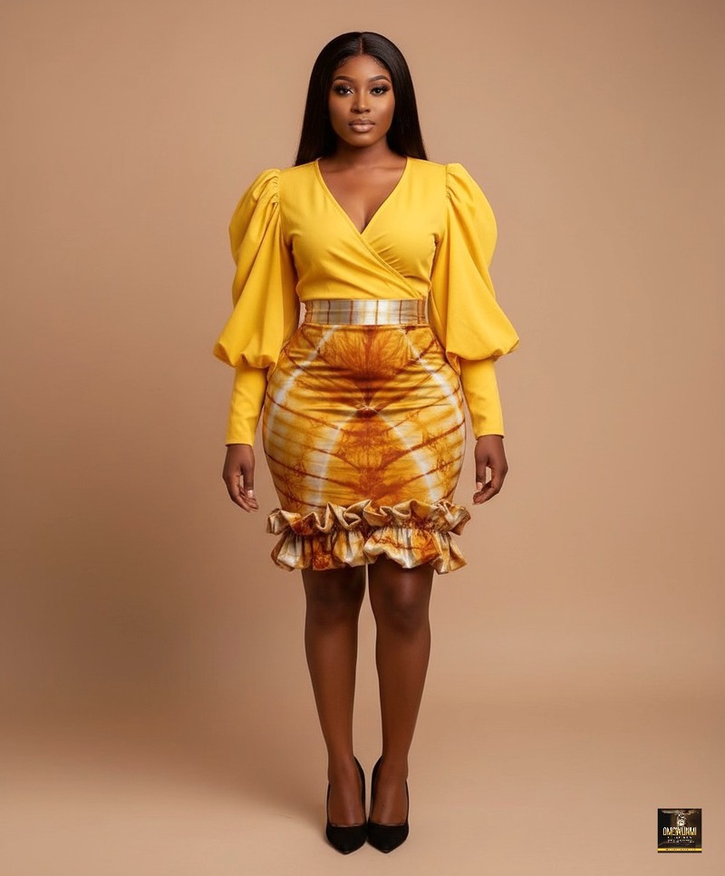 A high-fashion, two-piece ensemble that pairs a statement top with a figure-hugging skirt. The top features a flattering V-neck, a fitted bodice, and dramatically voluminous, long puff sleeves that exude confidence. The matching mini-skirt is cinched with a contrast belt-like waistband and finished with a playful, ruffled hem.Perfect for cocktail parties, social gatherings, or standing out at a fashionable event.