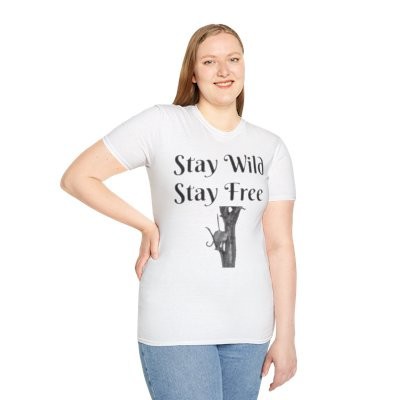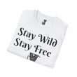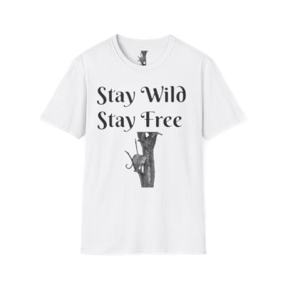 Lightweight, soft, and quietly bold — this classic crew tee carries a small wild heart. The shirt’s clean white canvas features a vintage-style black print: a nimble squirrel clinging to a tree and the hopeful line “Stay Wild / Stay Free.” Wear it while wandering city parks, slipping into a forest trail, or lounging at a weekend cabin. The fabric drapes easily, the ribbed collar keeps its shape, and the tear-away label means nothing rubs or distracts. It feels familiar from the first wear and keeps that lived-in comfort season after season. Subtle, nature-minded, and built for everyday movement.