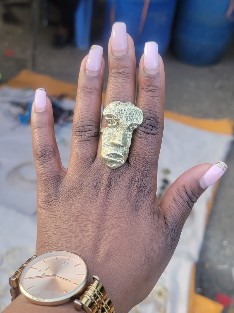 This striking gold ring, handcrafted by Kenyan artisans, features a textured face design that embodies cultural storytelling and expert craftsmanship. Paired with a sleek gold watch, this piece combines traditional heritage with modern elegance, making it a standout addition to any style.