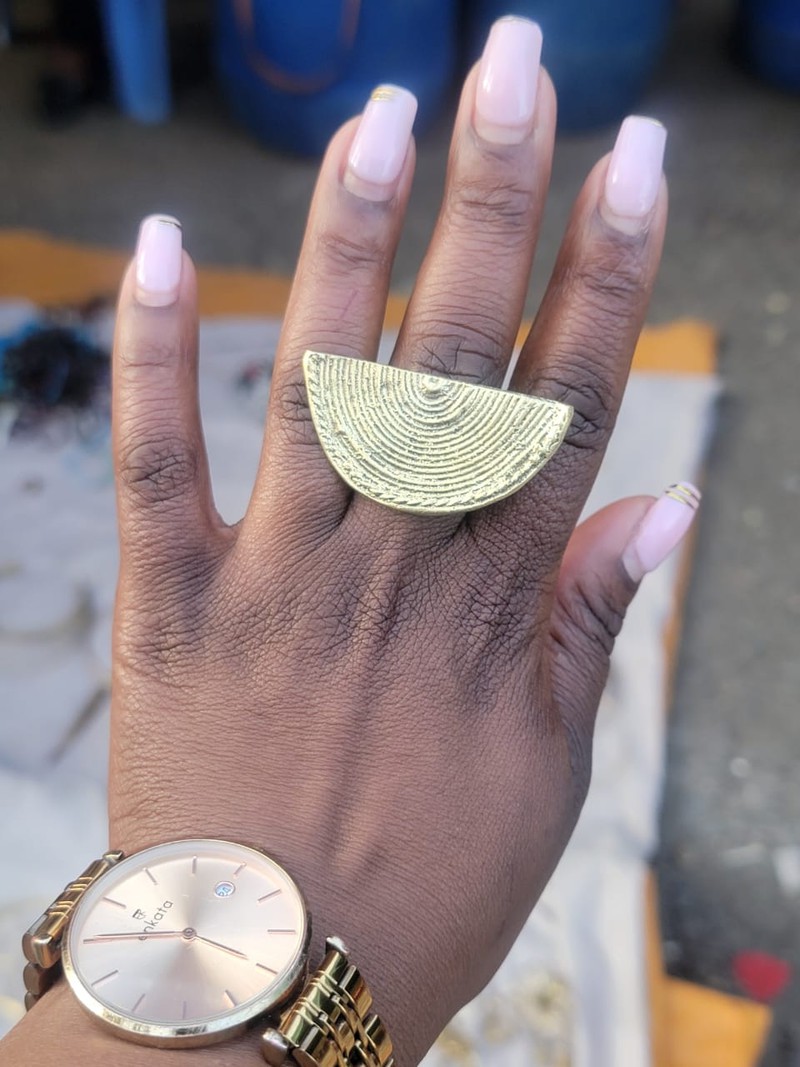 This striking gold ring, handcrafted by Kenyan artisans, features a textured face design that embodies cultural storytelling and expert craftsmanship. Paired with a sleek gold watch, this piece combines traditional heritage with modern elegance, making it a standout addition to any style.