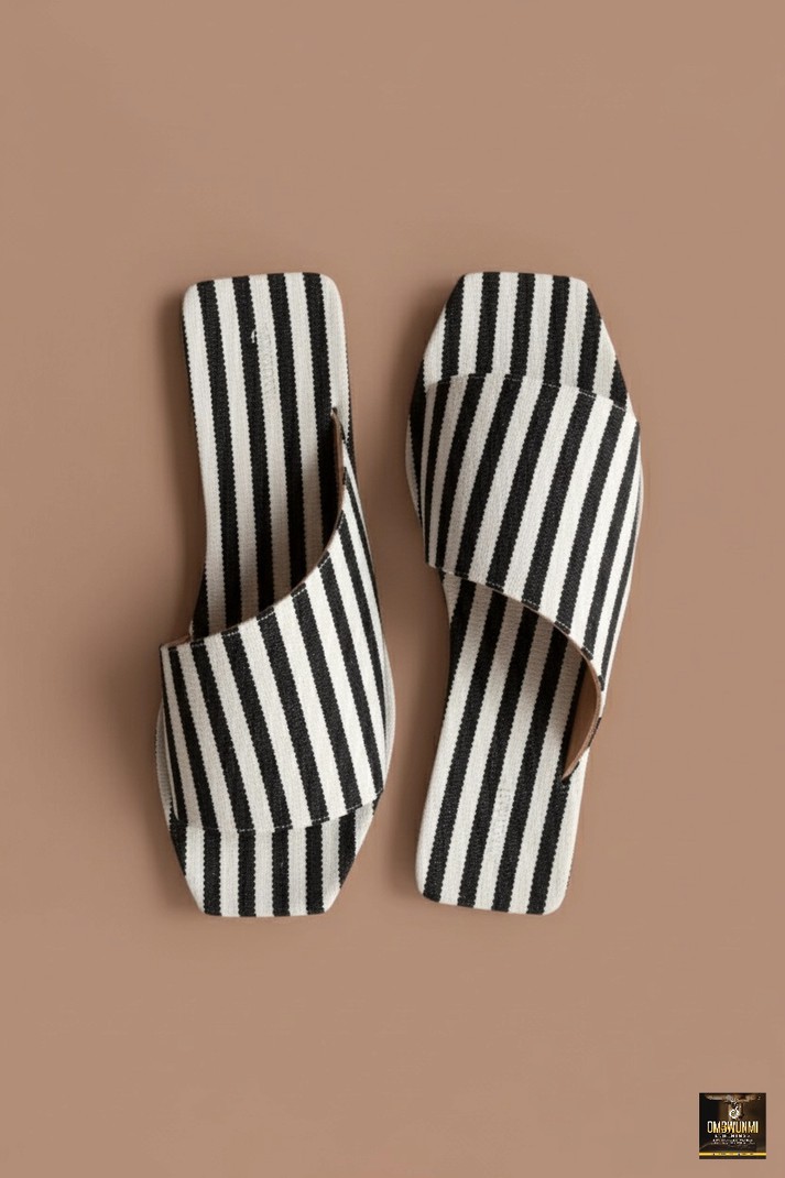 These contemporary slides offer a minimalist yet striking design, utilizing a multi-tonal striped pattern in a sophisticated color palette. The slides are constructed entirely from a textured textile material that features bold vertical stripes in black and white. A key feature is the asymmetrical strap design; the wide front strap curves dramatically from one side of the foot to the other, offering a secure fit and a distinct, modern silhouette that contrasts with the square-shaped toe. The striped pattern extends seamlessly across both the footbed and the upper strap, creating a cohesive and stylish look. Finished with a flat profile, these slides are the epitome of effortless chic and are perfect for adding a subtle pop of color and texture to any warm-weather ensemble.