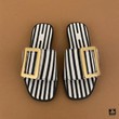 These sophisticated slip-on slides are a statement piece, blending classic pattern with modern hardware for a polished finish. The design features a wide, comfortable textile strap across the vamp, which showcases an elegant vertical stripe pattern in a rich palette of black and white. The textile has a substantial, woven texture, giving the slides a luxurious feel. The strap is adorned with a prominent, rectangular gold-toned buckle purely decorative, yet instantly elevating the look. Finished with a sleek black footbed and low-profile sole, these slides offer effortless style, making them perfect for transitioning from a chic day look to an elevated evening casual ensemble.