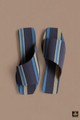 These contemporary slides offer a minimalist yet striking design, utilizing a multi-tonal striped pattern in a sophisticated color palette. The slides are constructed entirely from a textured textile material that features bold vertical stripes in dark navy blue, sky blue, and a cool sage green or beige. A key feature is the asymmetrical strap design; the wide front strap curves dramatically from one side of the foot to the other, offering a secure fit and a distinct, modern silhouette that contrasts with the square-shaped toe. The striped pattern extends seamlessly across both the footbed and the upper strap, creating a cohesive and stylish look. Finished with a flat profile, these slides are the epitome of effortless chic and are perfect for adding a subtle pop of color and texture to any warm-weather ensemble.