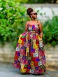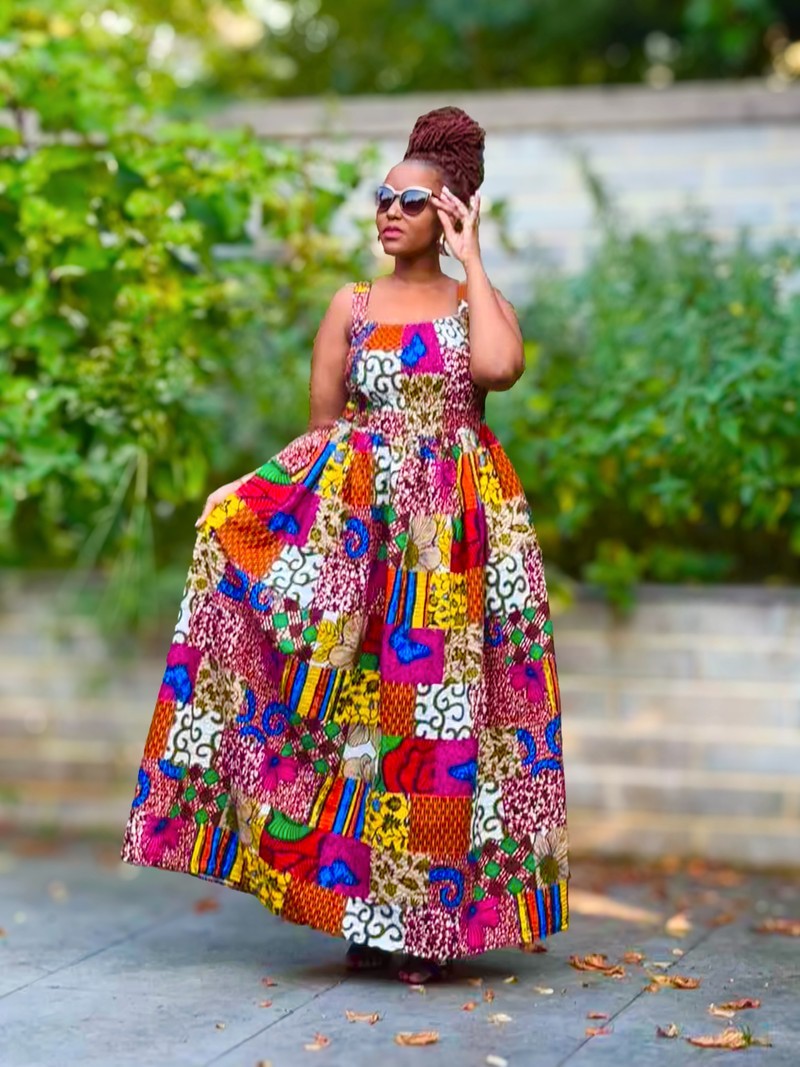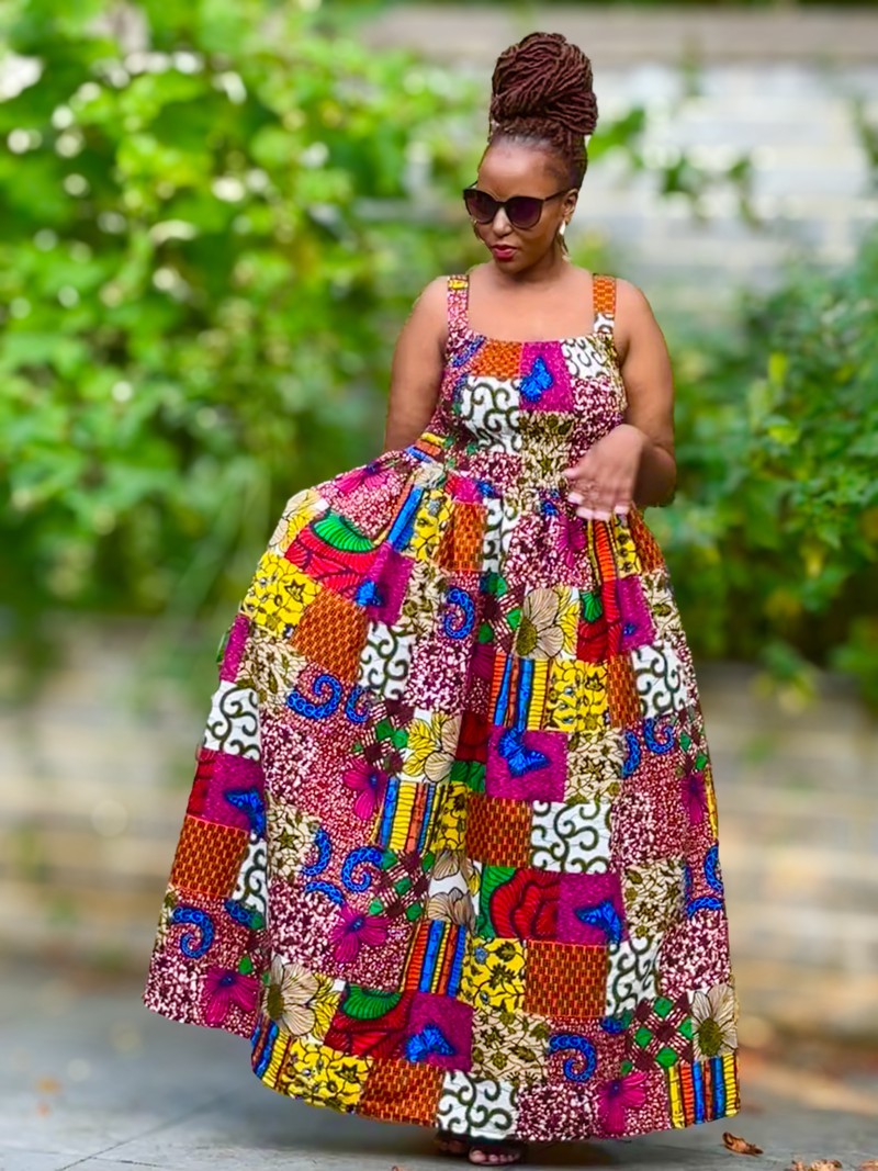 A smocked maxi sun dress in a patch work mixed print. It has smock at the bust with straps. A lovely easy to wear dress for a relaxed but chic look on warm days. Can be worn with a denim jacket and trainers, sandals or slippers. Style your way!