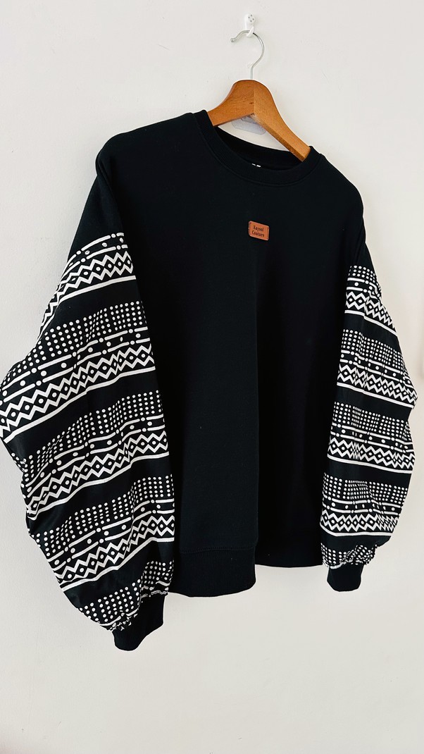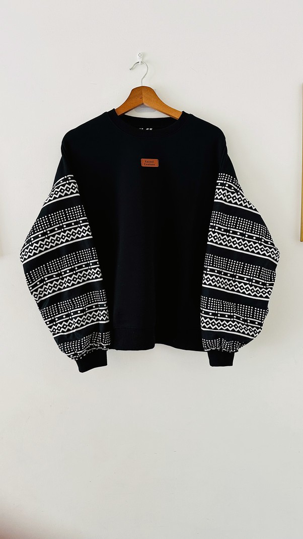 ✔️ 1 sweat noir – manches bogolan noir & blanc